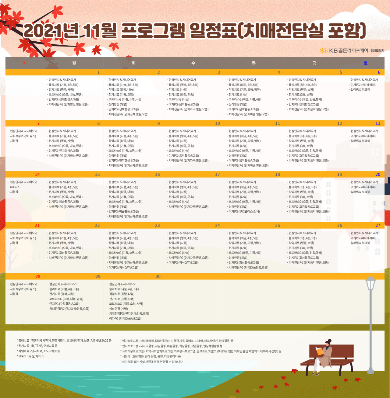 위례빌리지 [프로그램 안내] 2021년 위례 빌리지 11월 프로그램 일정표 페이지 정보 작성자 KB 골든라이프케어 댓글 0건 조회 3,773회 작성일 21-10-29 13:30 목록 본문 목록 이전글[프로그램안내] 2021년 서초빌리지 11월 프로그램 21.11.01 다음글[프로그램 안내] 2021년 강동케어센터 11월 프로그램 21.10.29