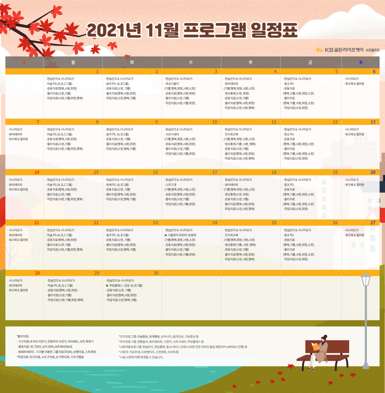 서초빌리지 [프로그램안내] 2021년 서초빌리지 11월 프로그램 페이지 정보 작성자 KB 골든라이프케어 댓글 0건 조회 3,196회 작성일 21-11-01 09:00 목록 본문 목록 이전글[프로그램 안내] 2021년 위례 케어센터 11월 프로그램 일정표 21.11.02 다음글[프로그램 안내] 2021년 위례 빌리지 11월 프로그램 일정표 21.10.29