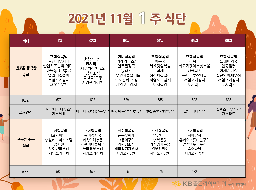 위례케어센터 [식단안내] 위례 케어센터 11월 1주차 식단표 페이지 정보 작성자 KB 골든라이프케어 댓글 0건 조회 2,807회 작성일 21-10-28 18:35 목록 본문 목록 이전글[식단안내] 위례 빌리지 11월 1주차 식단표 21.10.28 다음글[식단안내] 서초빌리지 11월 1주차 식단표 21.10.28