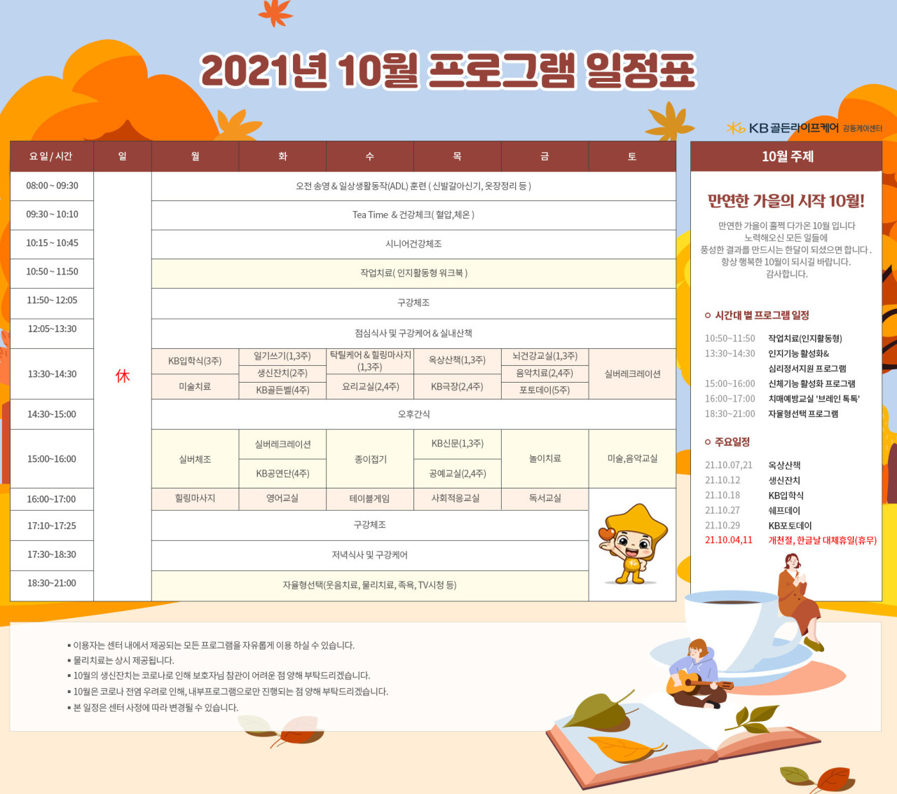 강동케어센터 [프로그램 안내] 2021년 강동케어센터 10월 프로그램 페이지 정보 작성자 KB 골든라이프케어 댓글 0건 조회 3,100회 작성일 21-09-29 11:54 목록 본문 목록 이전글[식단안내] 서초빌리지 10월 2주차 식단표 21.09.30 다음글[식단 안내] 2021년 강동케어센터 10월 식단표 21.09.29