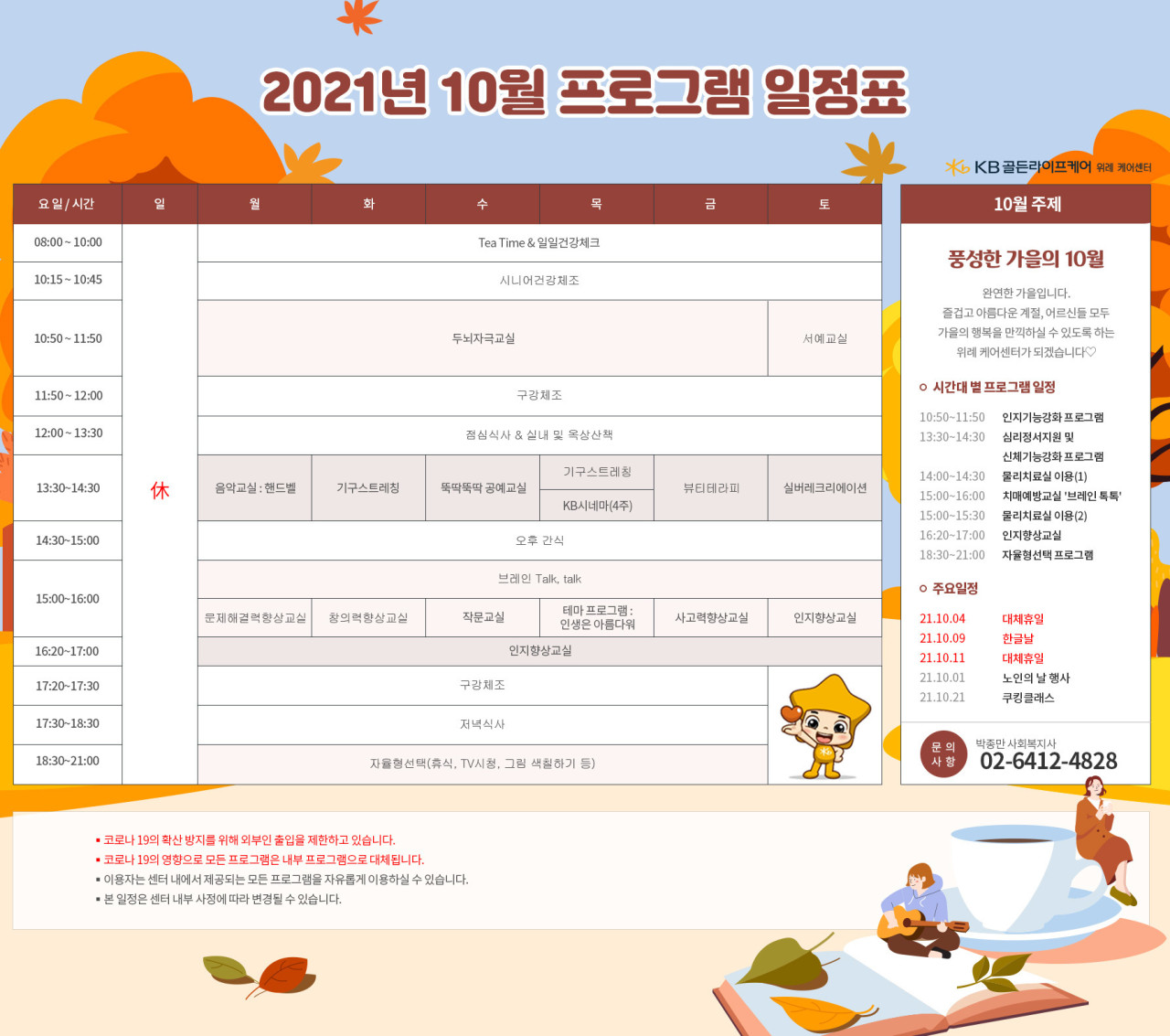 위례케어센터 [프로그램 안내] 2021년 위례 케어센터 10월 프로그램 일정표 페이지 정보 작성자 KB 골든라이프케어 댓글 0건 조회 3,563회 작성일 21-10-13 10:14 목록 본문 목록 이전글[오늘의식단]2021년 10월 13일 화요일 21.10.13 다음글[식단안내] 위례 케어센터 10월 3주차 식단표 21.10.08