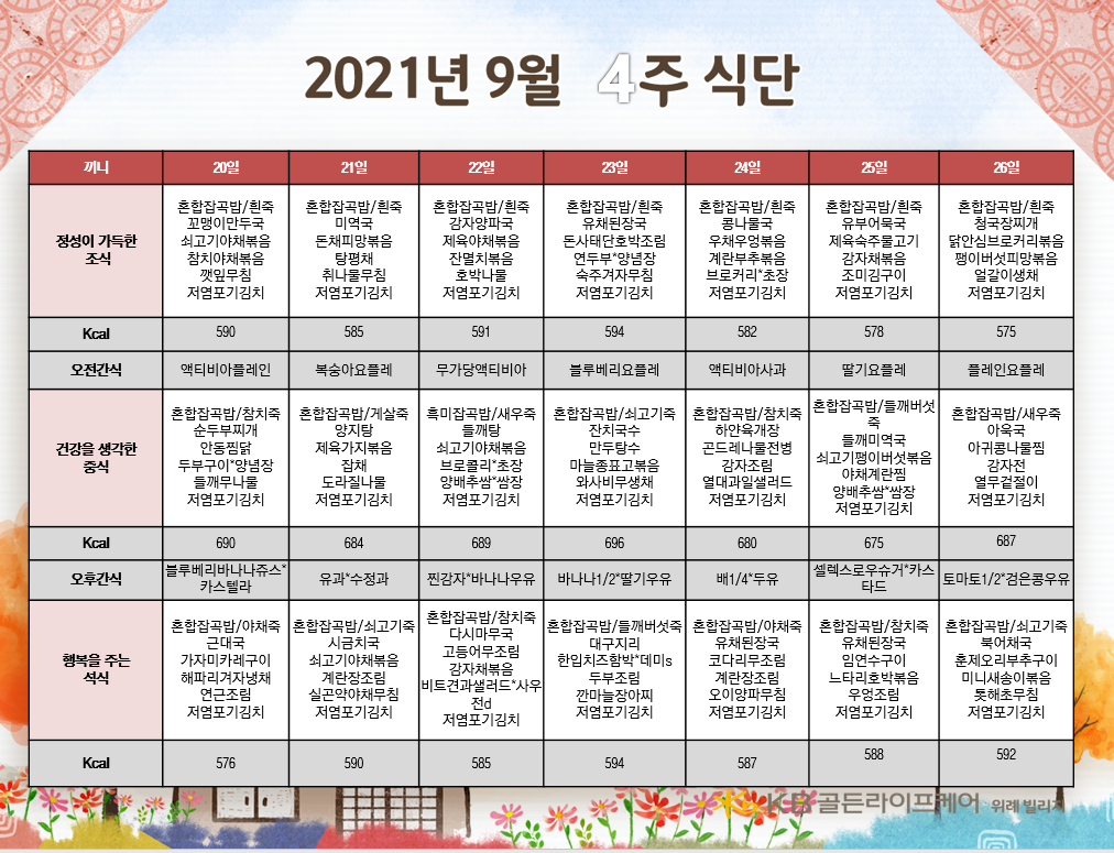 위례빌리지 [식단안내] 위례 빌리지 9월 4주차 식단표 페이지 정보 작성자 KB 골든라이프케어 댓글 0건 조회 2,977회 작성일 21-09-16 17:13 목록 본문 목록 이전글[식단안내] 위례 케어센터 9월 4주차 식단표 21.09.16 다음글[오늘의식단] 2021년 9월 14일 화요일 21.09.16