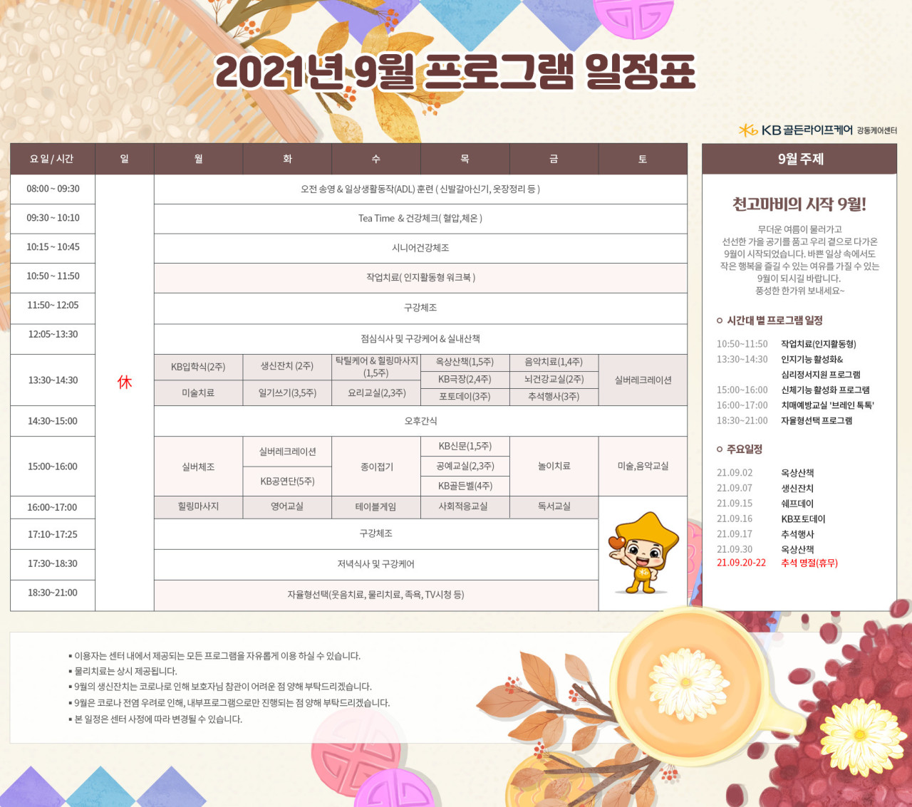 강동케어센터 [프로그램 안내] 2021년 강동케어센터 9월 프로그램 페이지 정보 작성자 KB 골든라이프케어 댓글 0건 조회 3,015회 작성일 21-08-30 16:59 목록 본문 목록 이전글[프로그램 안내] 2021년 위례 케어센터 9월 프로그램 일정표 21.08.31 다음글[식단 안내] 2021년 강동케어센터 9월 식단표 21.08.30
