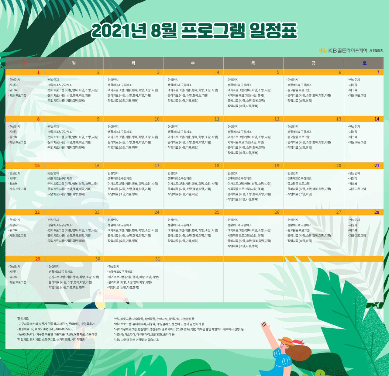 서초빌리지 [프로그램 안내] 2021년 서초 빌리지 8월 프로그램 일정표 페이지 정보 작성자 KB 골든라이프케어 댓글 0건 조회 3,739회 작성일 21-08-11 09:35 목록 본문 목록 이전글[오늘의식단] 2021년 8월 13일 금요일 21.08.13 다음글[오늘의식단] 2021년 8월 10일 화요일 21.08.10