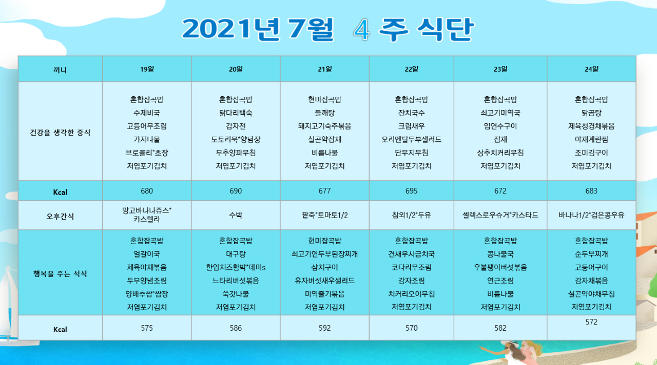 위례케어센터 [식단안내] 위례 케어센터 7월 4주차 식단표 페이지 정보 작성자 KB 골든라이프케어 댓글 0건 조회 3,001회 작성일 21-07-16 15:34 목록 본문 목록 이전글[오늘의식단] 2021년 7월 22일 목요일 21.07.22 다음글[식단안내] 위례 빌리지 7월 4주차 식단표 21.07.16