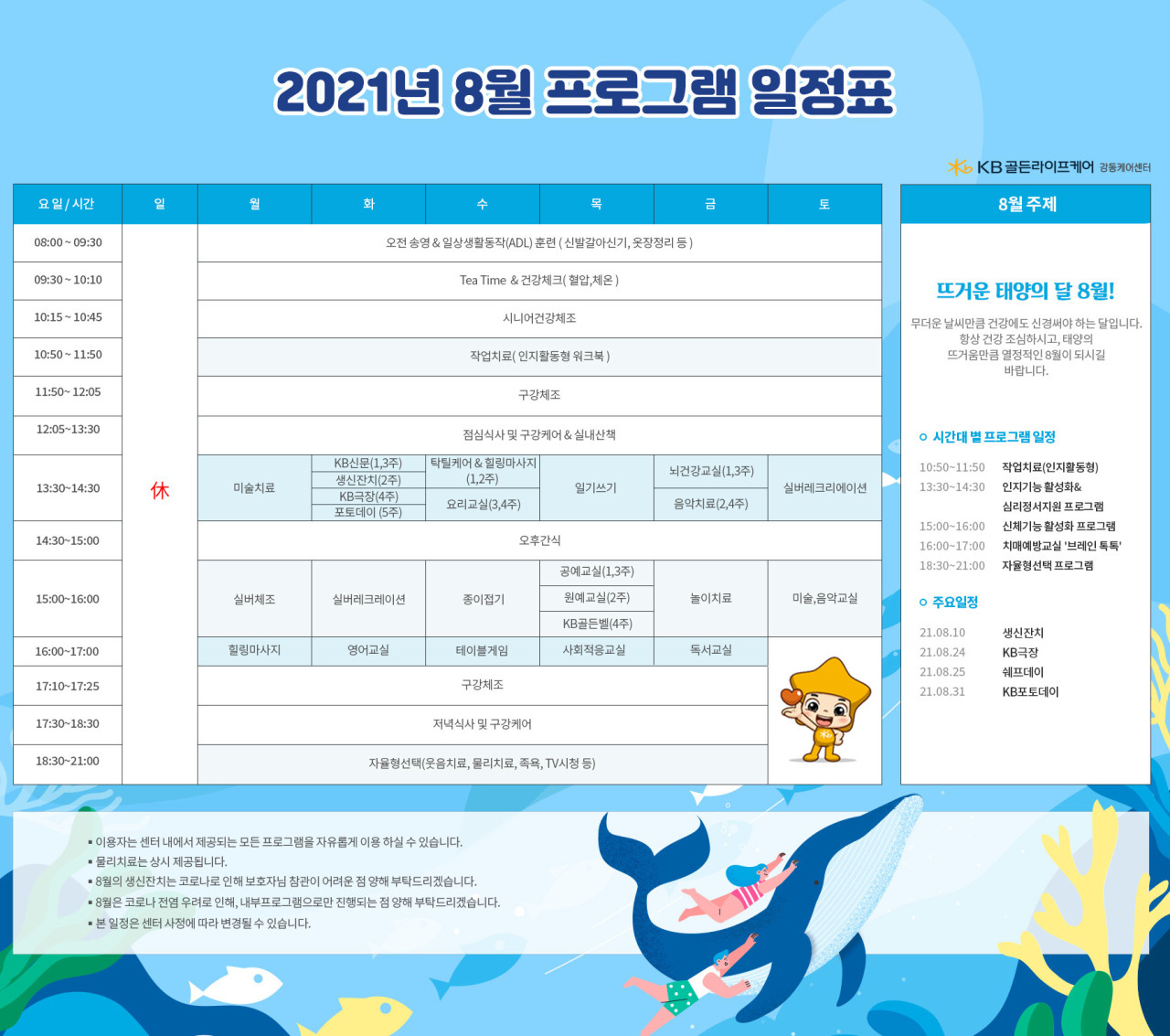 강동케어센터 [프로그램 안내] 2021년 강동케어센터 8월 프로그램 페이지 정보 작성자 KB 골든라이프케어 댓글 0건 조회 3,243회 작성일 21-07-28 10:45 목록 본문 목록 이전글[오늘의식단] 2021년 7월 29일 목요일 21.07.29 다음글[식단 안내] 2021년 강동케어센터 8월 식단표 21.07.28