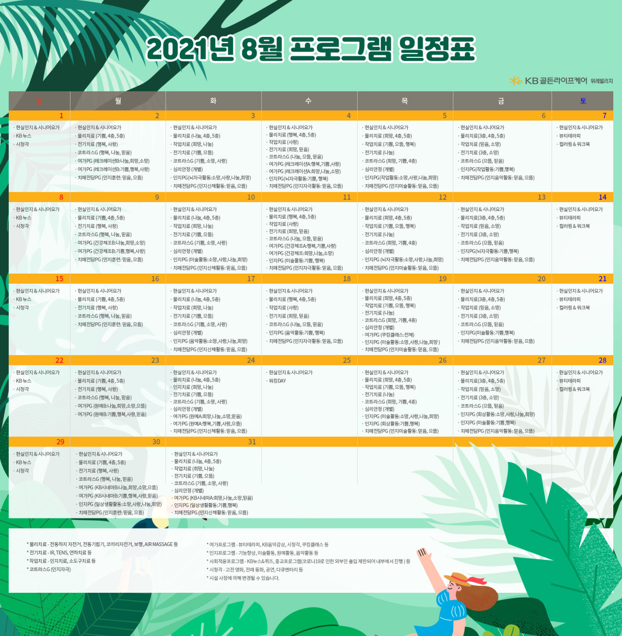 위례빌리지 [프로그램 안내] 2021년 위례 빌리지 8월 프로그램 일정표 페이지 정보 작성자 KB 골든라이프케어 댓글 0건 조회 4,341회 작성일 21-07-31 09:10 목록 본문 목록 이전글[오늘의식단] 2021년 8월 3일 화요일 21.08.03 다음글[식단안내] 서초 빌리지 8월 1주차 식단표 21.07.30