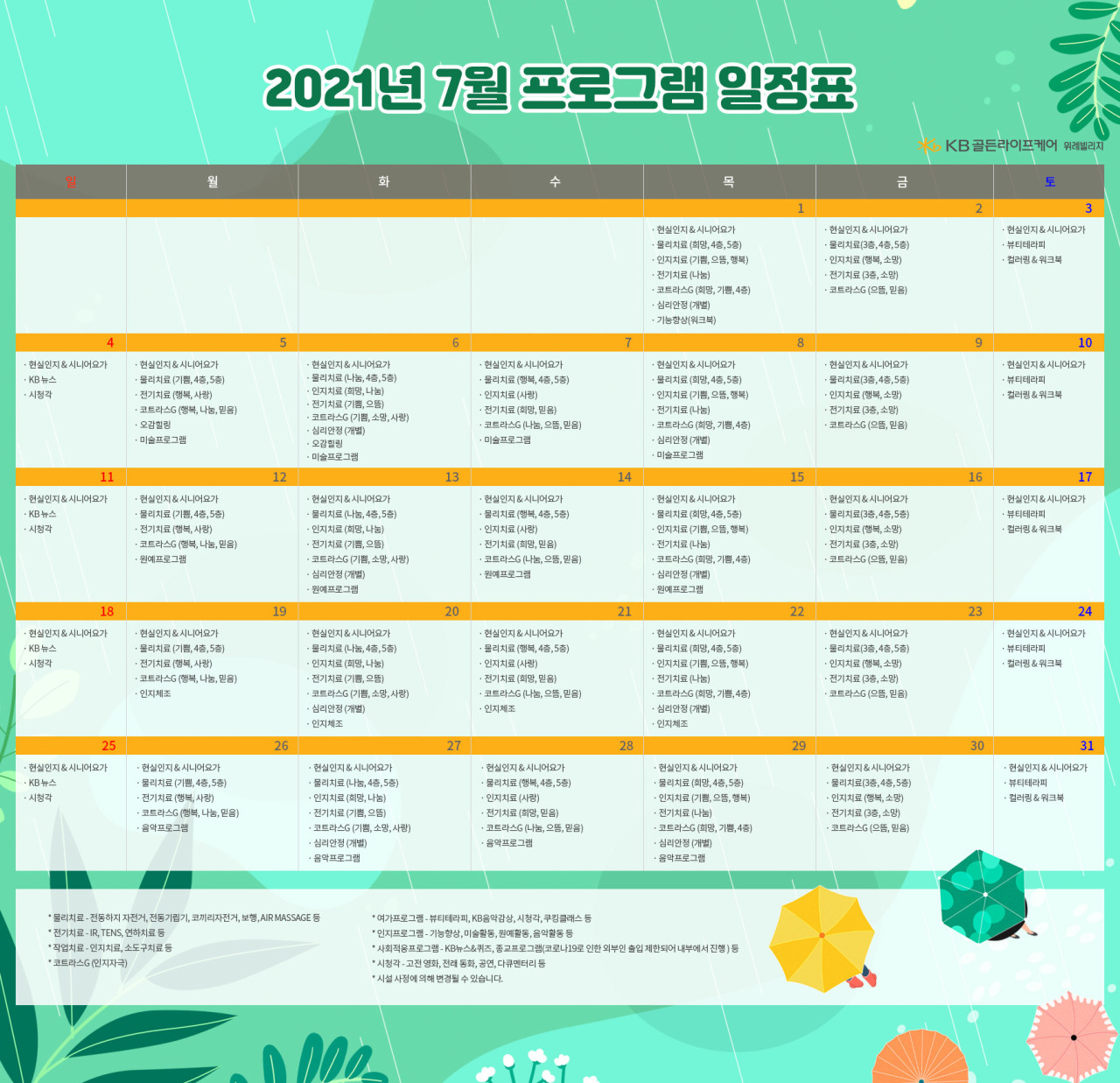 위례빌리지 [프로그램 안내] 2021년 위례 빌리지 7월 프로그램 일정표 페이지 정보 작성자 KB 골든라이프케어 댓글 0건 조회 4,196회 작성일 21-07-01 12:25 목록 본문 목록 이전글[프로그램 안내] 2021년 서초 빌리지 7월 프로그램 일정표 21.07.01 다음글[오늘의식단] 2021년 6월 29일 화요일 21.06.29