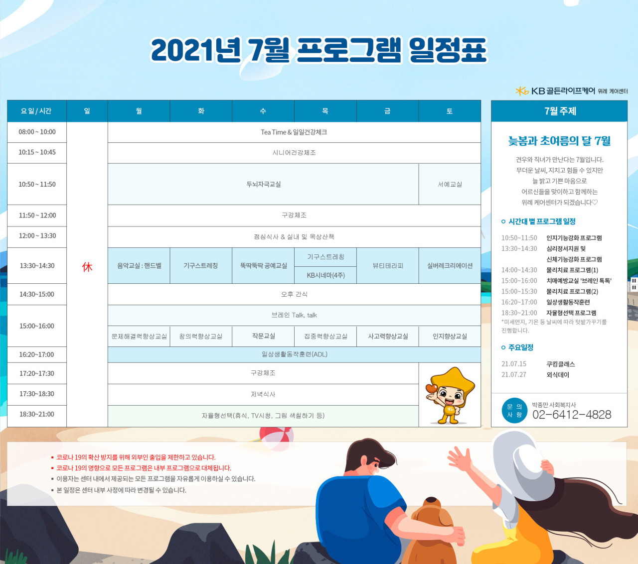 위례케어센터 [프로그램 안내] 2021년 위례 케어센터 7월 프로그램 일정표 페이지 정보 작성자 KB 골든라이프케어 댓글 0건 조회 4,303회 작성일 21-07-02 13:23 목록 본문 목록 이전글[식단안내] 위례 빌리지 7월2주차 식단표 21.07.02 다음글[프로그램 안내] 2021년 서초 빌리지 7월 프로그램 일정표 21.07.01
