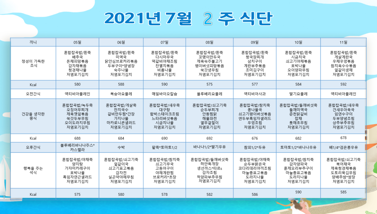 위례빌리지 [식단안내] 위례 빌리지 7월2주차 식단표 페이지 정보 작성자 KB 골든라이프케어 댓글 0건 조회 3,273회 작성일 21-07-02 14:08 목록 본문 목록 이전글[식단안내] 위례 케어센터 7월 2주차 식단표 21.07.02 다음글[프로그램 안내] 2021년 위례 케어센터 7월 프로그램 일정표 21.07.02