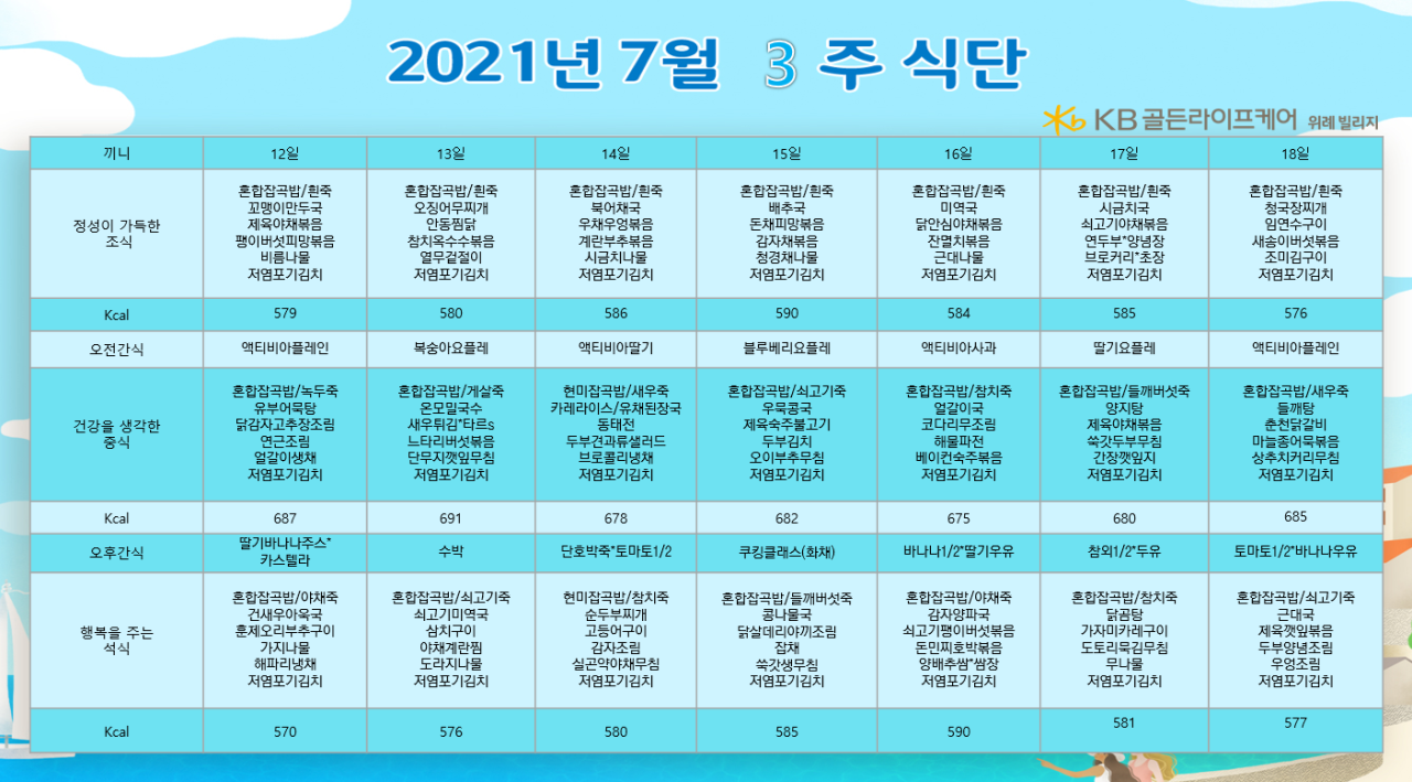 위례빌리지 [식단안내] 위례 빌리지 7월 3주차 식단표 페이지 정보 작성자 KB 골든라이프케어 댓글 0건 조회 3,275회 작성일 21-07-09 15:59 목록 본문 목록 이전글[식단안내] 위례 케어센터 7월 3주차 식단표 21.07.09 다음글[식단안내] 서초빌리지 7월 3주차 식단표 21.07.09