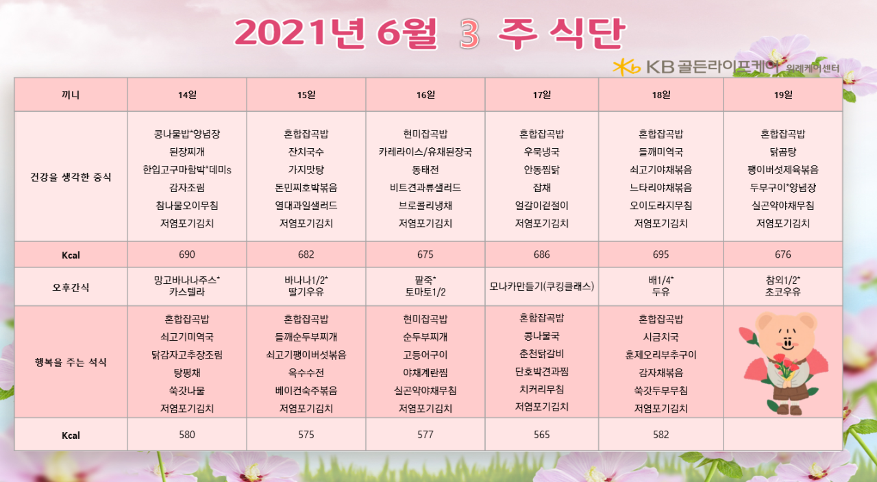 위례케어센터 [식단안내] 위례 케어센터 6월 3주차 식단표 페이지 정보 작성자 KB 골든라이프케어 댓글 0건 조회 3,242회 작성일 21-06-11 13:18 목록 본문 목록 이전글[식단안내] 서초 빌리지 6월 3주차 식단표 21.06.14 다음글[식단안내] 위례 빌리지 6월 3주차 식단표 21.06.11