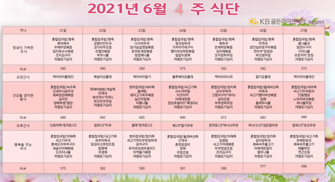 위례케어센터 [식단안내] 위례 케어센터 6월4주차 식단표 페이지 정보 작성자 KB 골든라이프케어 댓글 0건 조회 3,350회 작성일 21-06-17 15:43 목록 본문 목록 이전글[오늘의식단] 2021년 6월 18일 금요일 21.06.18 다음글[식단안내] 위례 빌리지 6월 4주차 식단표 21.06.17