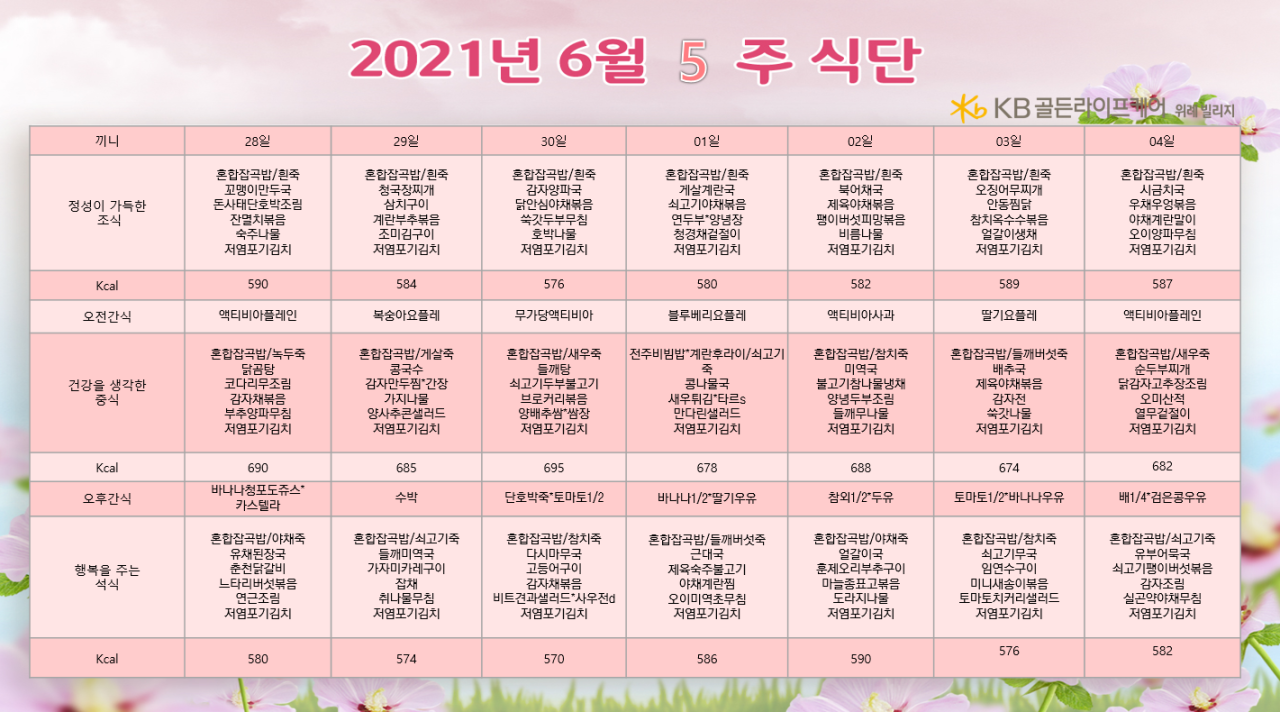 위례빌리지 [식단안내] 위례 빌리지 6월 5주차 식단표 페이지 정보 작성자 KB 골든라이프케어 댓글 0건 조회 3,141회 작성일 21-06-25 13:10 목록 본문 목록 이전글[식단안내] 위례 케어센터 6월 5주차 식단표 21.06.25 다음글[식단안내] 서초빌리지 6월 5주차 식단표 21.06.23