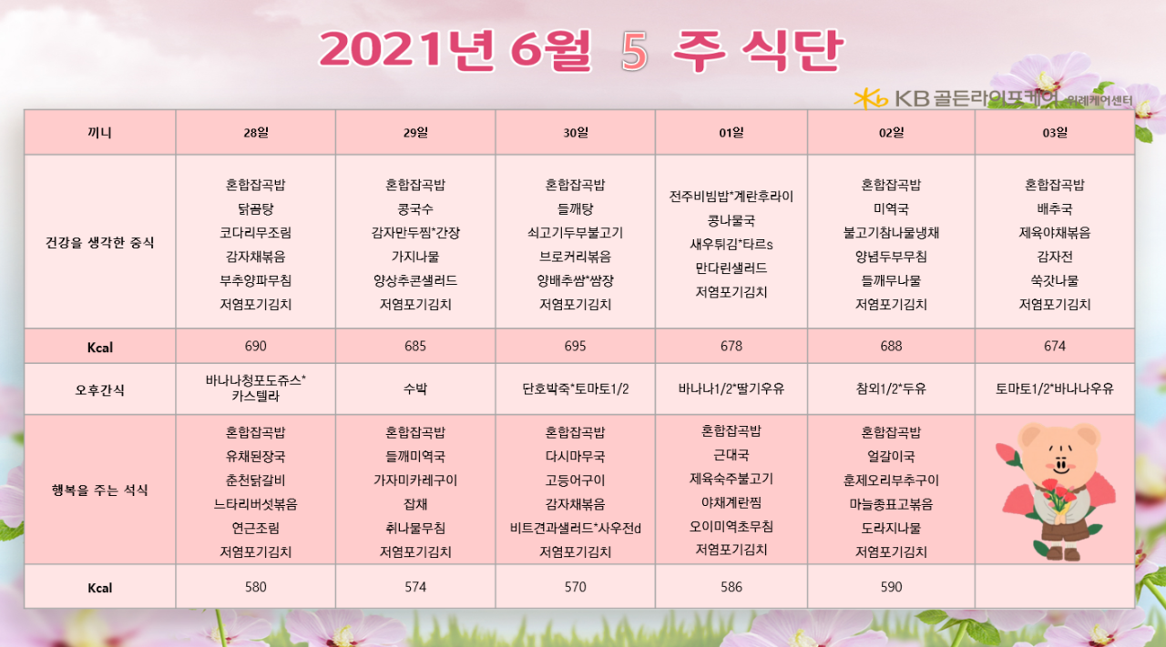 위례케어센터 [식단안내] 위례 케어센터 6월 5주차 식단표 페이지 정보 작성자 KB 골든라이프케어 댓글 0건 조회 3,287회 작성일 21-06-25 13:10 목록 본문 목록 이전글[오늘의식단] 2021년 6월 25일 금요일 21.06.25 다음글[식단안내] 위례 빌리지 6월 5주차 식단표 21.06.25