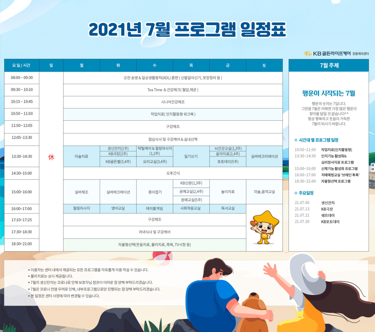 강동케어센터 [프로그램 안내] 2021년 강동케어센터 7월 프로그램 페이지 정보 작성자 KB 골든라이프케어 댓글 0건 조회 3,040회 작성일 21-06-28 16:27 목록 본문 목록 이전글[오늘의식단] 2021년 6월 29일 화요일 21.06.29 다음글[식단 안내] 2021년 강동케어센터 7월 식단표 21.06.28
