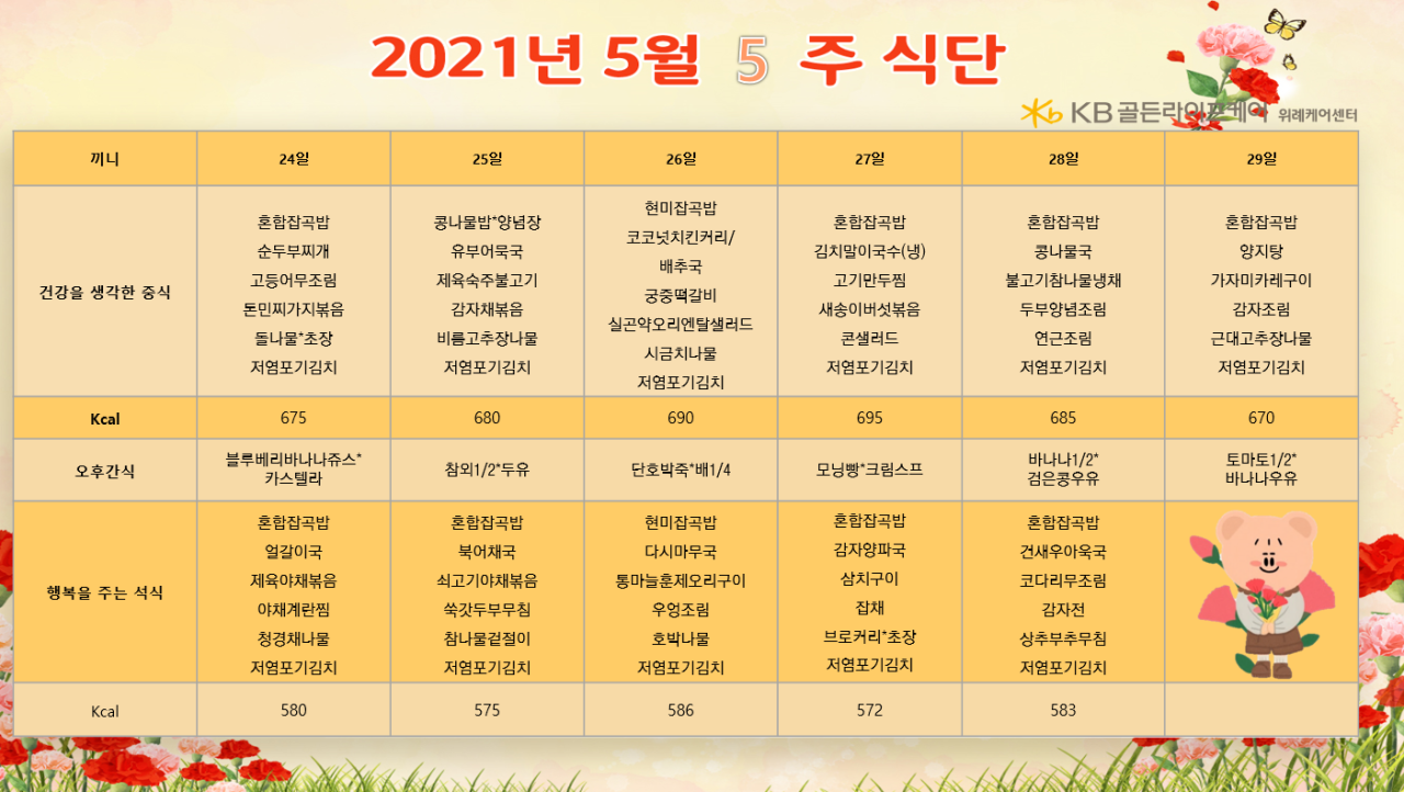 위례케어센터 [식단안내] 위례 케어센터 5월 5주차 식단표 페이지 정보 작성자 KB 골든라이프케어 댓글 0건 조회 3,333회 작성일 21-05-21 15:36 목록 본문 목록 이전글[오늘의식단] 2021년 5월 22일 토요일 21.05.22 다음글[식단안내] 위례 빌리지 5월 5주차 식단표 21.05.21