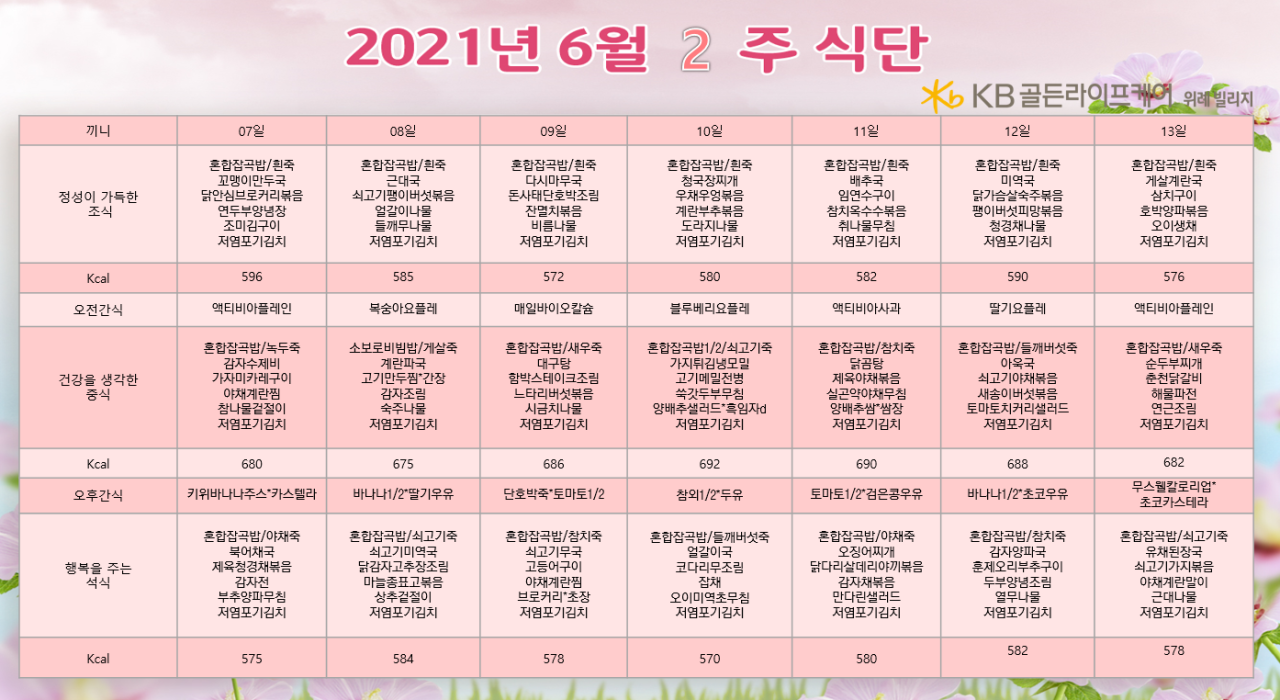 위례빌리지 [식단안내] 위례 빌리지 6월 2주차 식단표 페이지 정보 작성자 KB 골든라이프케어 댓글 0건 조회 3,471회 작성일 21-06-04 12:23 목록 본문 목록 이전글[식단안내] 위례 케어센터 6월 2주차 식단표 21.06.04 다음글[프로그램 안내] 2021년 위례 케어센터 6월 프로그램 일정표 21.06.01