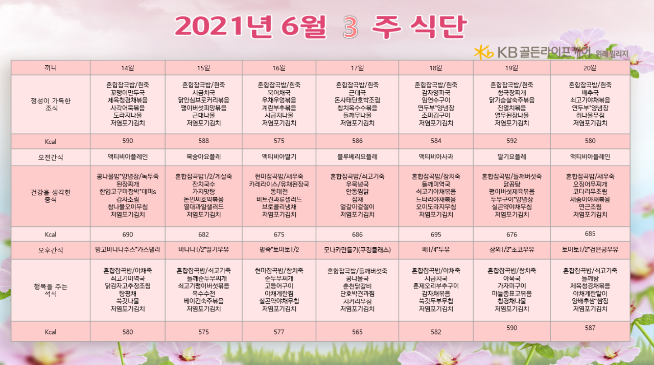 위례빌리지 [식단안내] 위례 빌리지 6월 3주차 식단표 페이지 정보 작성자 KB 골든라이프케어 댓글 0건 조회 3,418회 작성일 21-06-11 13:18 목록 본문 목록 이전글[식단안내] 위례 케어센터 6월 3주차 식단표 21.06.11 다음글[오늘의식단] 2021년 6월 8일 화요일 21.06.08
