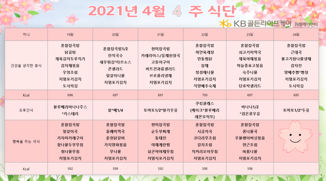 위례케어센터 [식단안내] 위례 케어센터 4월 4주차 식단표 페이지 정보 작성자 KB 골든라이프케어 댓글 0건 조회 3,627회 작성일 21-04-16 15:22 목록 본문 목록 이전글[식단안내] 위례 빌리지 4월 5주차 식단표 21.04.23 다음글[식단안내] 위례 빌리지 4월 4주차 식단표 21.04.16