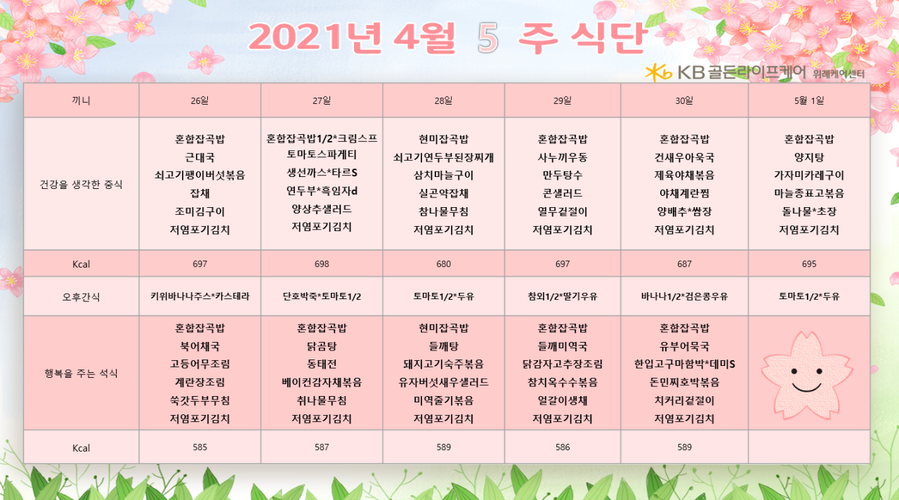 위례케어센터 [식단안내] 위례 케어센터 4월 5주차 식단표 페이지 정보 작성자 KB 골든라이프케어 댓글 0건 조회 3,538회 작성일 21-04-23 10:36 목록 본문 목록 이전글[식단 안내] 2021년 강동케어센터 5월 식단표 21.04.28 다음글[식단안내] 위례 빌리지 4월 5주차 식단표 21.04.23