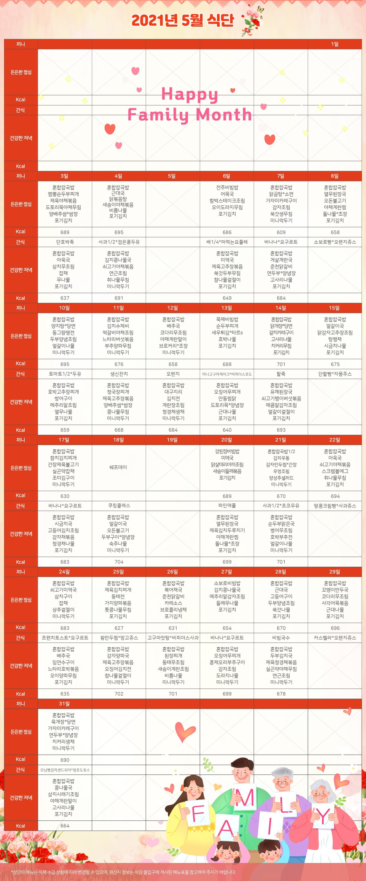 강동케어센터 [식단 안내] 2021년 강동케어센터 5월 식단표 페이지 정보 작성자 KB 골든라이프케어 댓글 0건 조회 3,449회 작성일 21-04-28 14:43 목록 본문 목록 이전글[프로그램 안내] 2021년 강동케어센터 5월 프로그램 21.04.28 다음글[식단안내] 위례 케어센터 4월 5주차 식단표 21.04.23