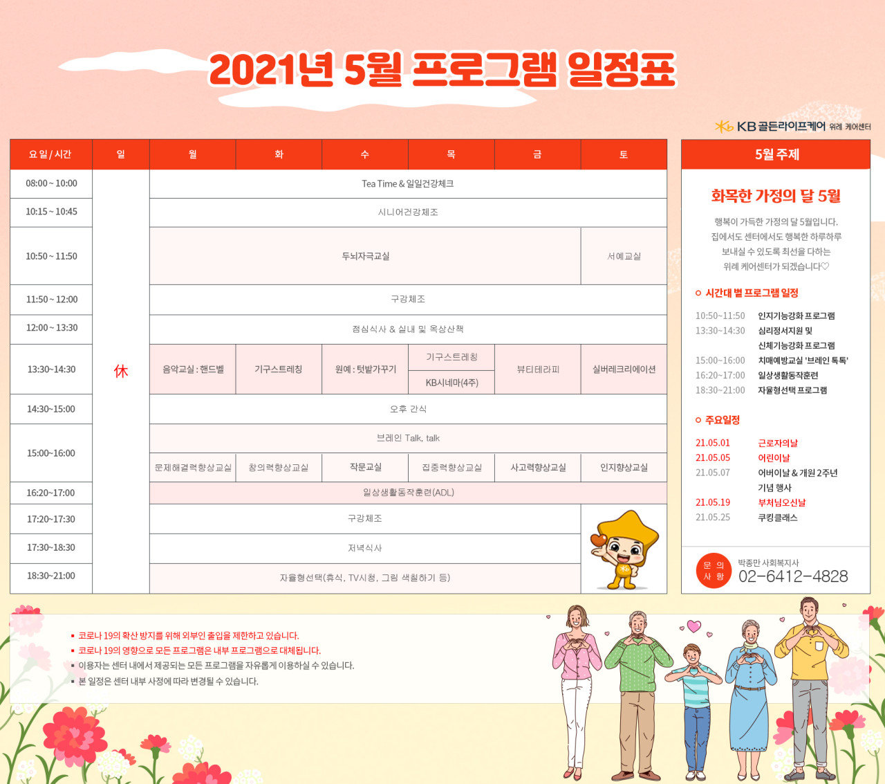 위례케어센터 [프로그램 안내] 2021년 위례 케어센터 5월 프로그램 일정표 페이지 정보 작성자 KB 골든라이프케어 댓글 0건 조회 4,759회 작성일 21-04-30 10:50 목록 본문 목록 이전글[식단안내] 위례 빌리지 5월 2주차 식단표 21.04.30 다음글[프로그램 안내] 2021년 강동케어센터 5월 프로그램 21.04.28