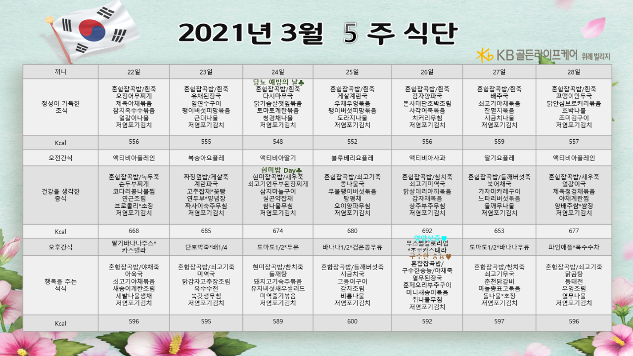 위례빌리지 [식단안내] 위례 빌리지 3월 5주차 식단표 페이지 정보 작성자 KB 골든라이프케어 댓글 0건 조회 3,480회 작성일 21-03-26 15:03 목록 본문 목록 이전글[식단안내] 위례 케어센터 3월 5주차 식단표 21.03.26 다음글[식단안내] 위례 케어센터 3월 4주차 식단표 21.03.19