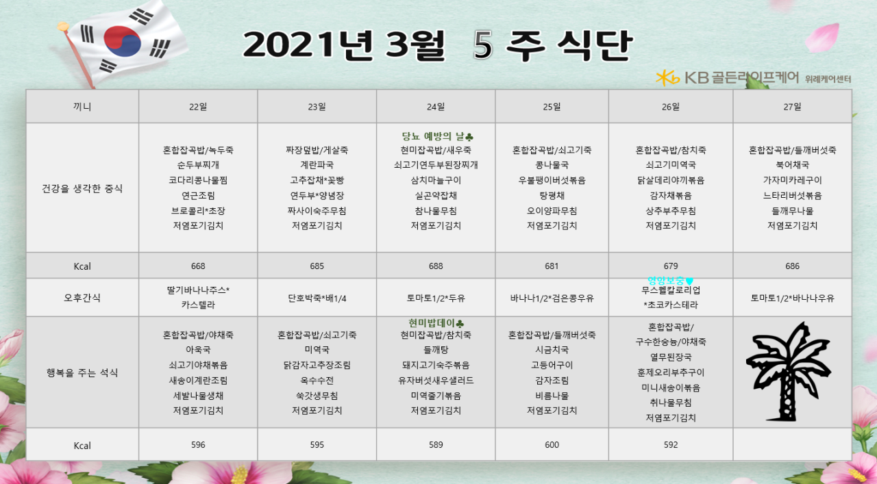 위례케어센터 [식단안내] 위례 케어센터 3월 5주차 식단표 페이지 정보 작성자 KB 골든라이프케어 댓글 0건 조회 3,559회 작성일 21-03-26 15:04 목록 본문 목록 이전글[식단안내] 위례 케어센터 4월 1주차 식단표 21.03.26 다음글[식단안내] 위례 빌리지 3월 5주차 식단표 21.03.26