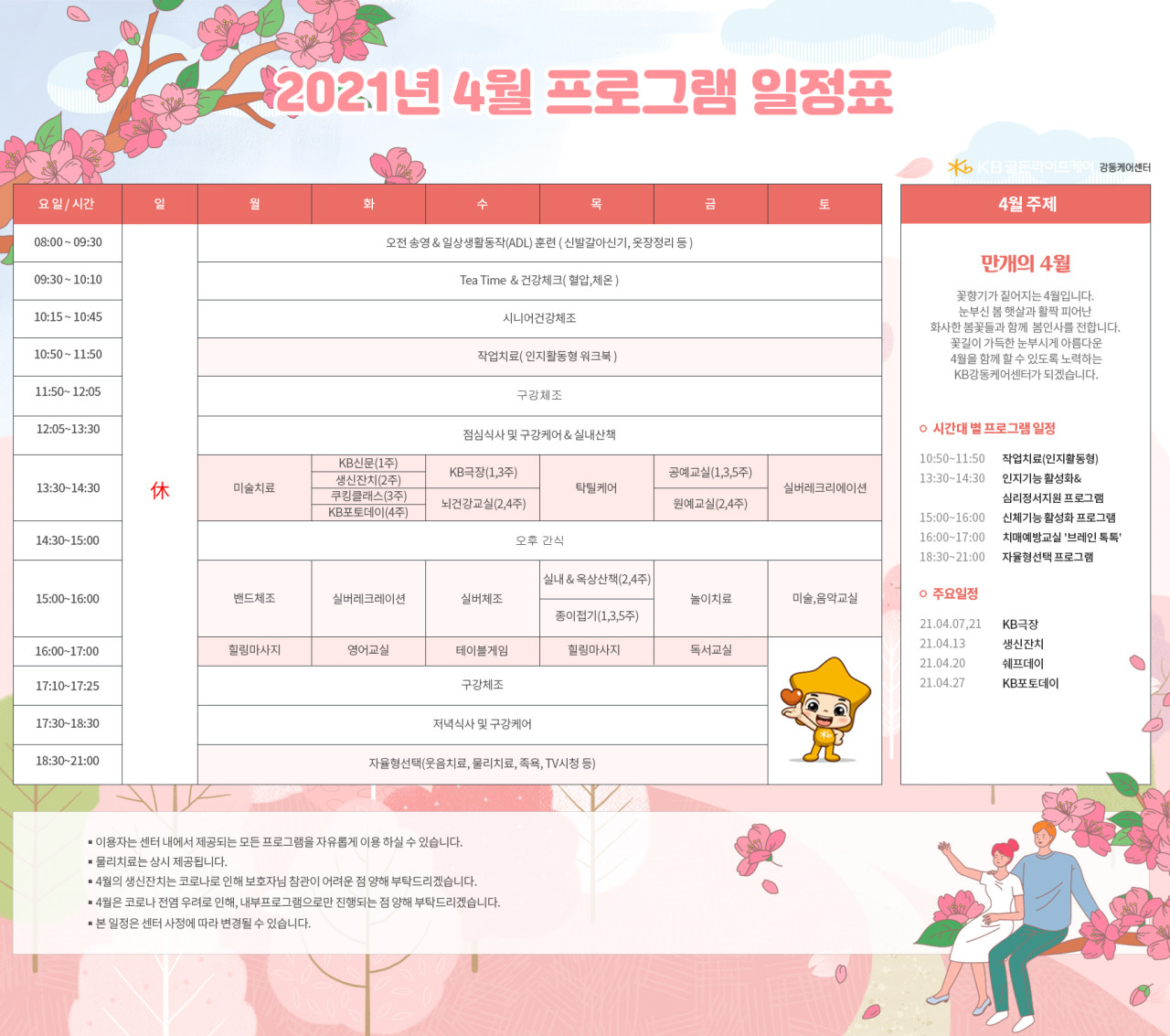 강동케어센터 [프로그램 안내] 2021년 강동케어센터 4월 프로그램 페이지 정보 작성자 KB 골든라이프케어 댓글 0건 조회 3,803회 작성일 21-03-30 16:31 목록 본문 목록 이전글[프로그램 안내] 2021년 위례 빌리지 4월 프로그램 일정표 21.04.02 다음글[식단 안내] 2021년 강동케어센터 4월 식단표 21.03.30