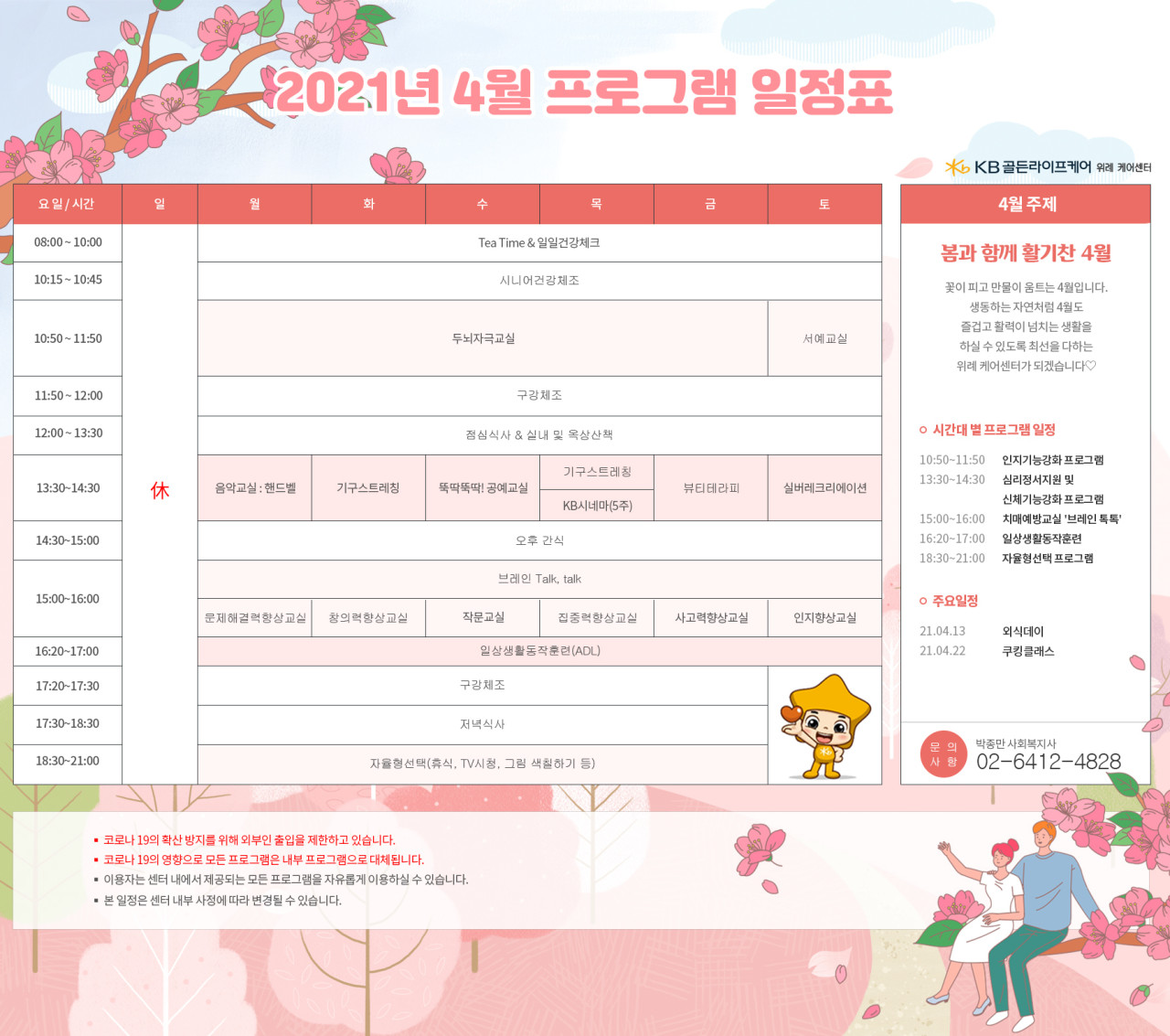 위례케어센터 [프로그램 안내] 2021년 위례 케어센터 4월 프로그램 일정표 페이지 정보 작성자 KB 골든라이프케어 댓글 0건 조회 5,264회 작성일 21-04-05 08:24 목록 본문 목록 이전글[식단안내] 위례 빌리지 4월 3주차 식단표 21.04.08 다음글[식단안내] 위례 케어센터 4월 2주차 식단표 21.04.02