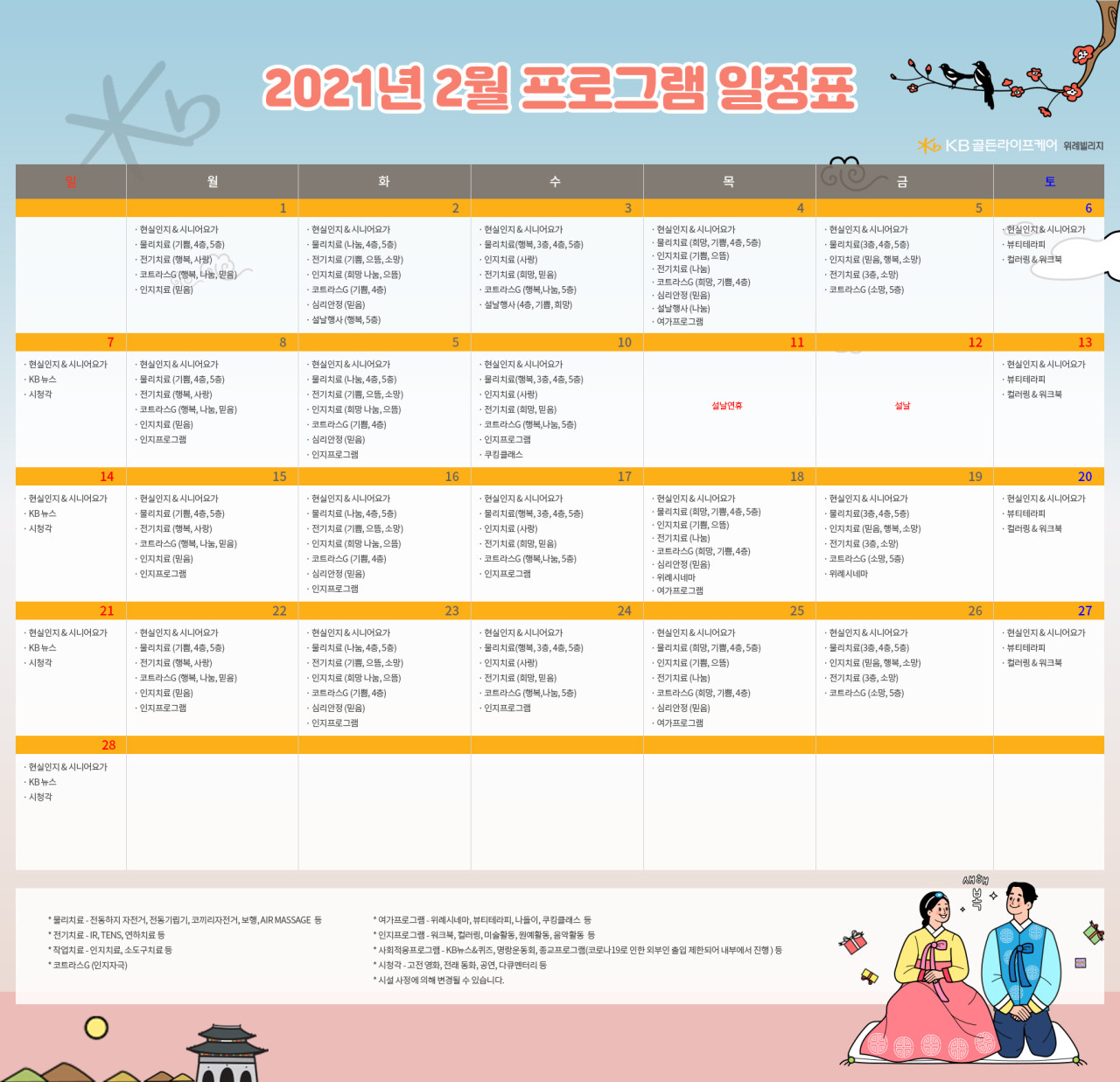위례빌리지 [프로그램 안내] 2021년 위례 빌리지 2월 프로그램 일정표 페이지 정보 작성자 KB 골든라이프케어 댓글 0건 조회 6,864회 작성일 21-02-05 17:19 목록 본문 목록 이전글[식단안내] 위례 빌리지 2월 3주차 식단표 21.02.15 다음글[식단안내] 위례 케어센터 2월 2주차 식단표 21.02.05
