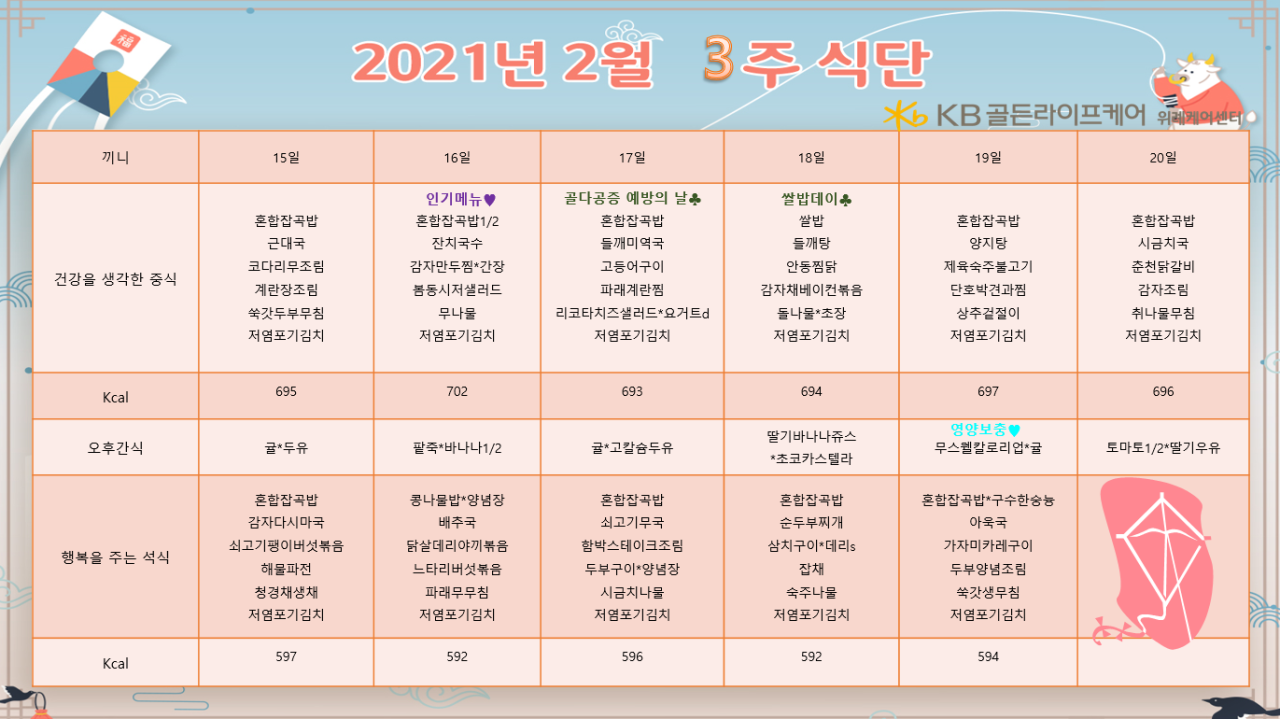 위례케어센터 [식단안내] 위례 케어센터 2월 3주차 식단표 페이지 정보 작성자 KB 골든라이프케어 댓글 0건 조회 3,522회 작성일 21-02-15 09:34 목록 본문 목록 이전글[식단안내] 위례 빌리지 2월 4주차 식단표 21.02.19 다음글[식단안내] 위례 빌리지 2월 3주차 식단표 21.02.15