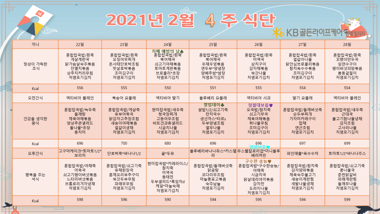위례빌리지 [식단안내] 위례 빌리지 2월 4주차 식단표 페이지 정보 작성자 KB 골든라이프케어 댓글 0건 조회 3,704회 작성일 21-02-19 11:52 목록 본문 목록 이전글[식단안내] 위례 케어센터 2월 4주차 식단표 21.02.19 다음글[식단안내] 위례 케어센터 2월 3주차 식단표 21.02.15