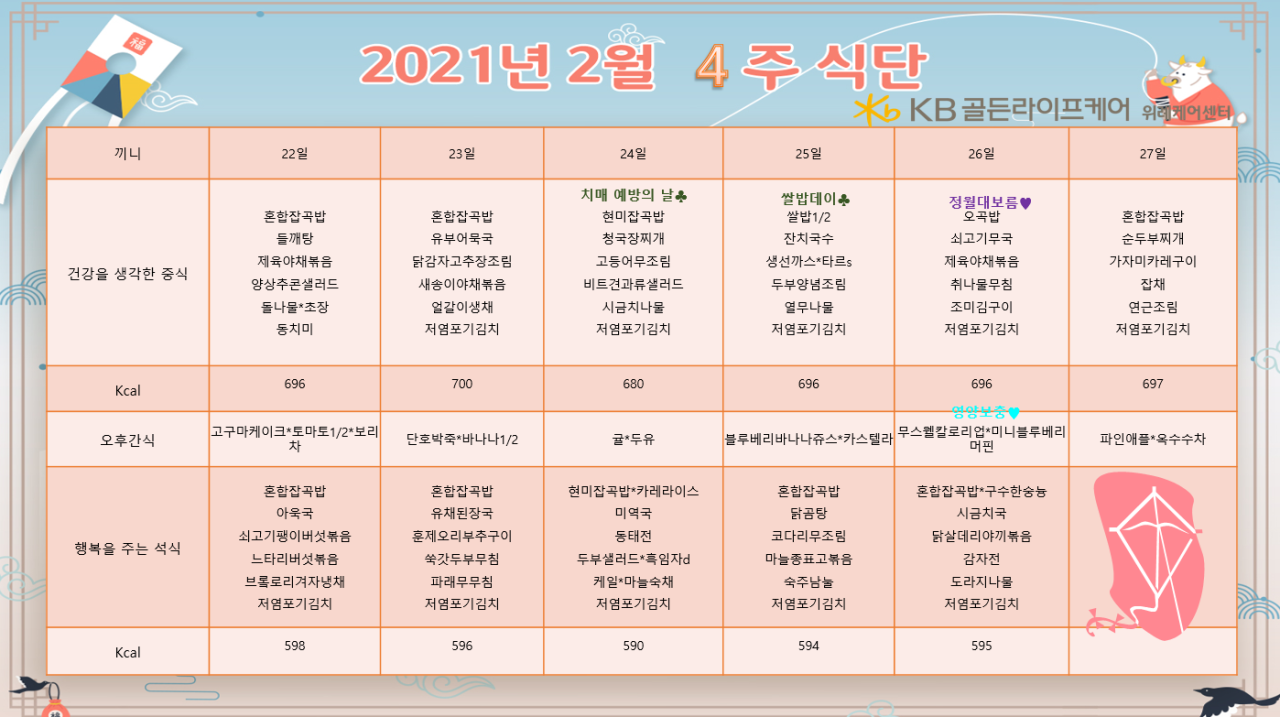 위례케어센터 [식단안내] 위례 케어센터 2월 4주차 식단표 페이지 정보 작성자 KB 골든라이프케어 댓글 0건 조회 3,736회 작성일 21-02-19 11:53 목록 본문 목록 이전글[식단 안내] 2021년 강동케어센터 3월 식단표 21.02.25 다음글[식단안내] 위례 빌리지 2월 4주차 식단표 21.02.19