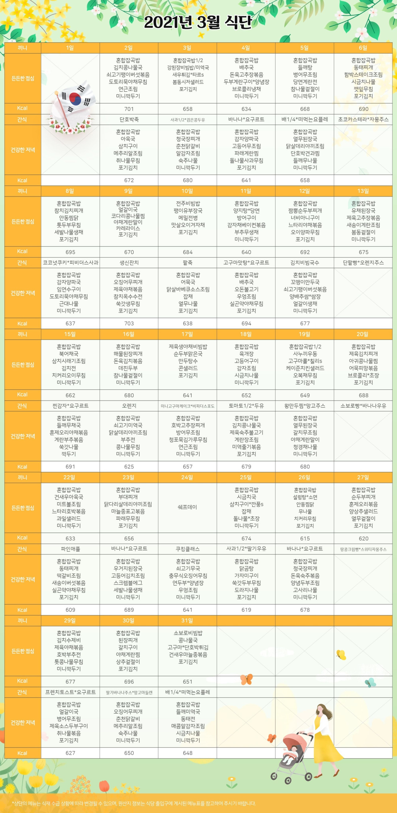 강동케어센터 [식단 안내] 2021년 강동케어센터 3월 식단표 페이지 정보 작성자 KB 골든라이프케어 댓글 0건 조회 3,467회 작성일 21-02-25 09:48 목록 본문 목록 이전글[프로그램 안내] 2021년 강동케어센터3월 프로그램 21.02.25 다음글[식단안내] 위례 케어센터 2월 4주차 식단표 21.02.19