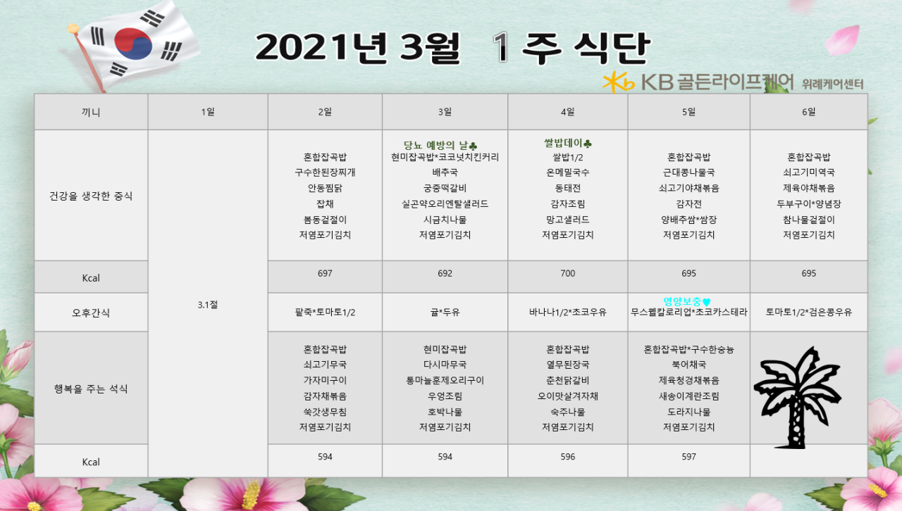 위례케어센터 [식단안내] 위례 케어센터 3월 1주차 식단표 페이지 정보 작성자 KB 골든라이프케어 댓글 0건 조회 3,731회 작성일 21-02-26 11:08 목록 본문 목록 이전글[프로그램 안내] 2021년 위례 빌리지 3월 프로그램 일정표 21.03.02 다음글[식단안내] 위례 빌리지 3월 1주차 식단표 21.02.26