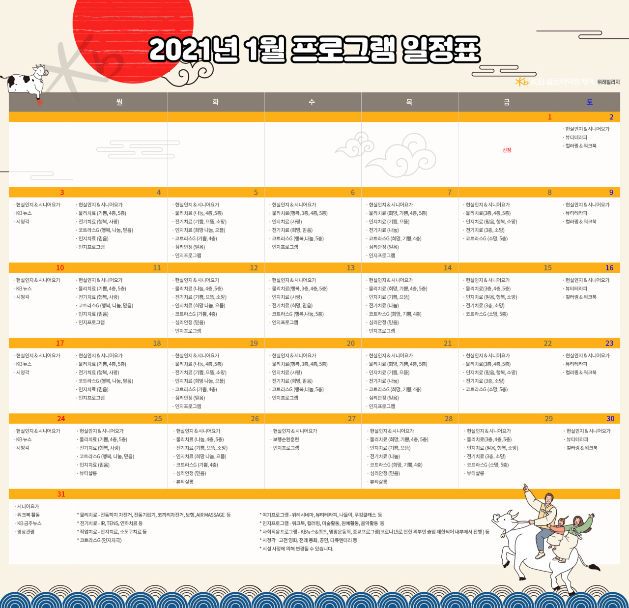 위례빌리지 [프로그램 안내] 2021년 위례 빌리지 01월 프로그램 일정표 페이지 정보 작성자 KB 골든라이프케어 댓글 0건 조회 6,803회 작성일 21-01-01 11:51 목록 본문 목록 이전글[프로그램 안내] 2021년위례 케어센터 1월 프로그램 일정표 21.01.04 다음글[식단안내] 위례 케어센터 1월 1주차 식단표 20.12.30