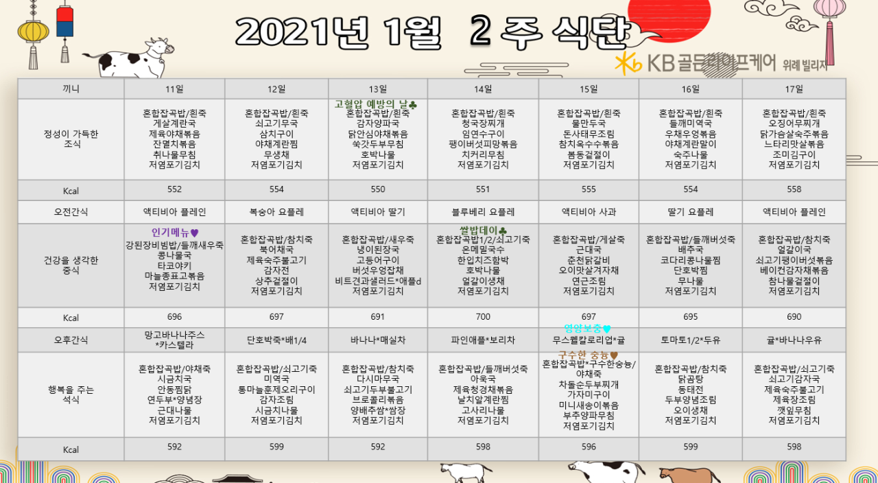 위례빌리지 [식단안내] 위례 빌리지 1월 2주차 식단표 페이지 정보 작성자 KB 골든라이프케어 댓글 0건 조회 3,972회 작성일 21-01-07 14:34 목록 본문 목록 이전글[식단안내] 위례 케어센터 1월 2주차 식단표 21.01.07 다음글[프로그램 안내] 2021년위례 케어센터 1월 프로그램 일정표 21.01.04