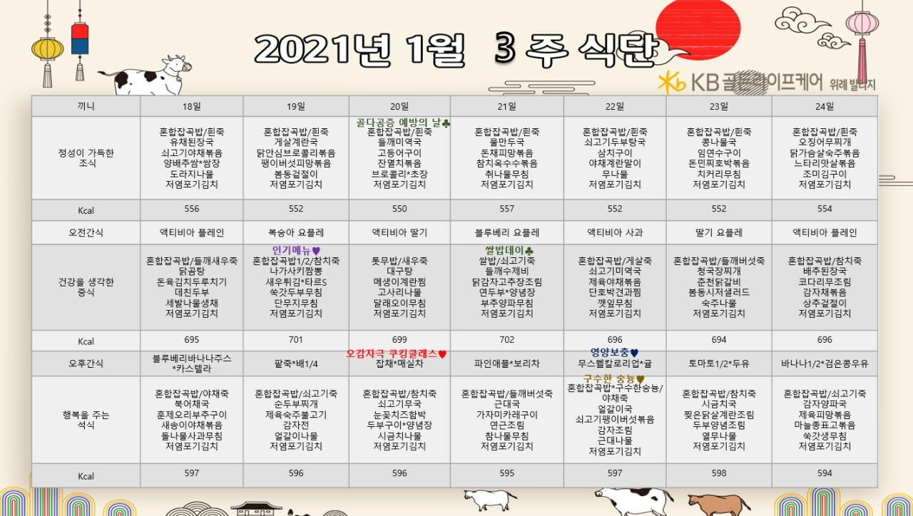 위례빌리지 [식단안내] 위례 빌리지 1월 3주차 식단표 페이지 정보 작성자 KB 골든라이프케어 댓글 0건 조회 3,636회 작성일 21-01-14 15:08 목록 본문 목록 이전글[식단안내] 위례 케어센터 1월 3주차 식단표 21.01.14 다음글[식단안내] 위례 케어센터 1월 2주차 식단표 21.01.07