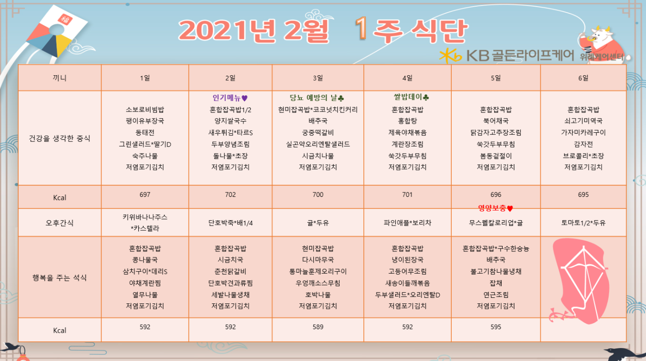 위례케어센터 [식단안내] 위례 케어센터 2월 1주차 식단표 페이지 정보 작성자 KB 골든라이프케어 댓글 0건 조회 3,401회 작성일 21-01-29 14:45 목록 본문 목록 이전글[프로그램 안내] 2021년 위례 케어센터 2월 프로그램 일정표 21.02.04 다음글[식단안내] 위례 빌리지 2월 1주차 식단표 21.01.29