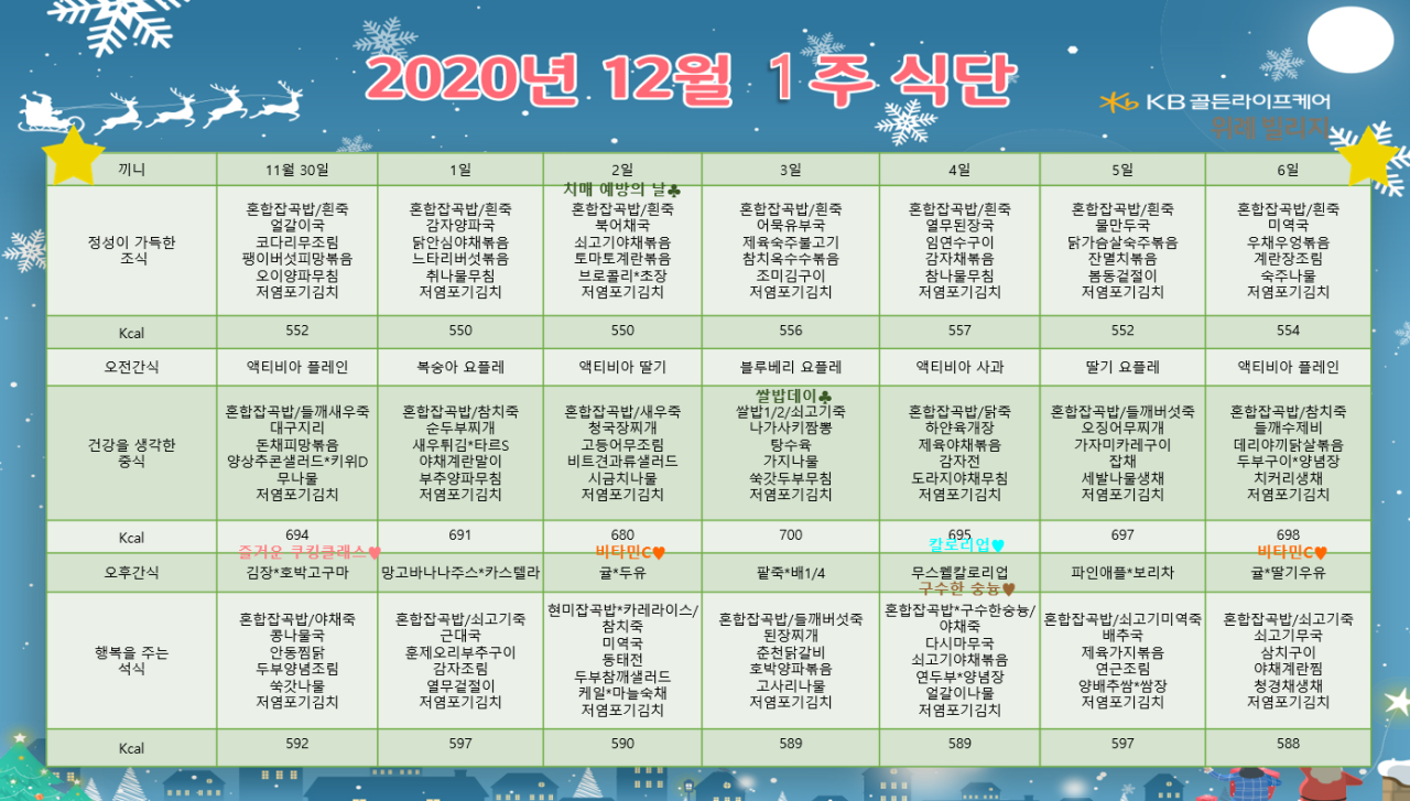 위례빌리지 [식단안내] 위례 빌리지 12월 1주차 식단표 페이지 정보 작성자 KB 골든라이프케어 댓글 0건 조회 3,801회 작성일 20-11-30 10:25 목록 본문 목록 이전글[식단안내] 위례 케어센터 12월 1주차 식단표 20.11.30 다음글[프로그램 안내] 2020년 위례 케어센터 12월 프로그램 일정표 20.11.27