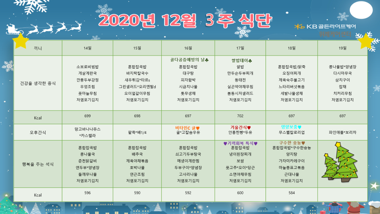 위례케어센터 [식단안내] 위례 케어센터 12월 3주차 식단표 페이지 정보 작성자 KB 골든라이프케어 댓글 0건 조회 3,874회 작성일 20-12-10 10:54 목록 본문 목록 이전글[식단안내] 위례 빌리지 12월 4주차 식단표 20.12.18 다음글[식단안내] 위례 빌리지 12월 3주차 식단표 20.12.10