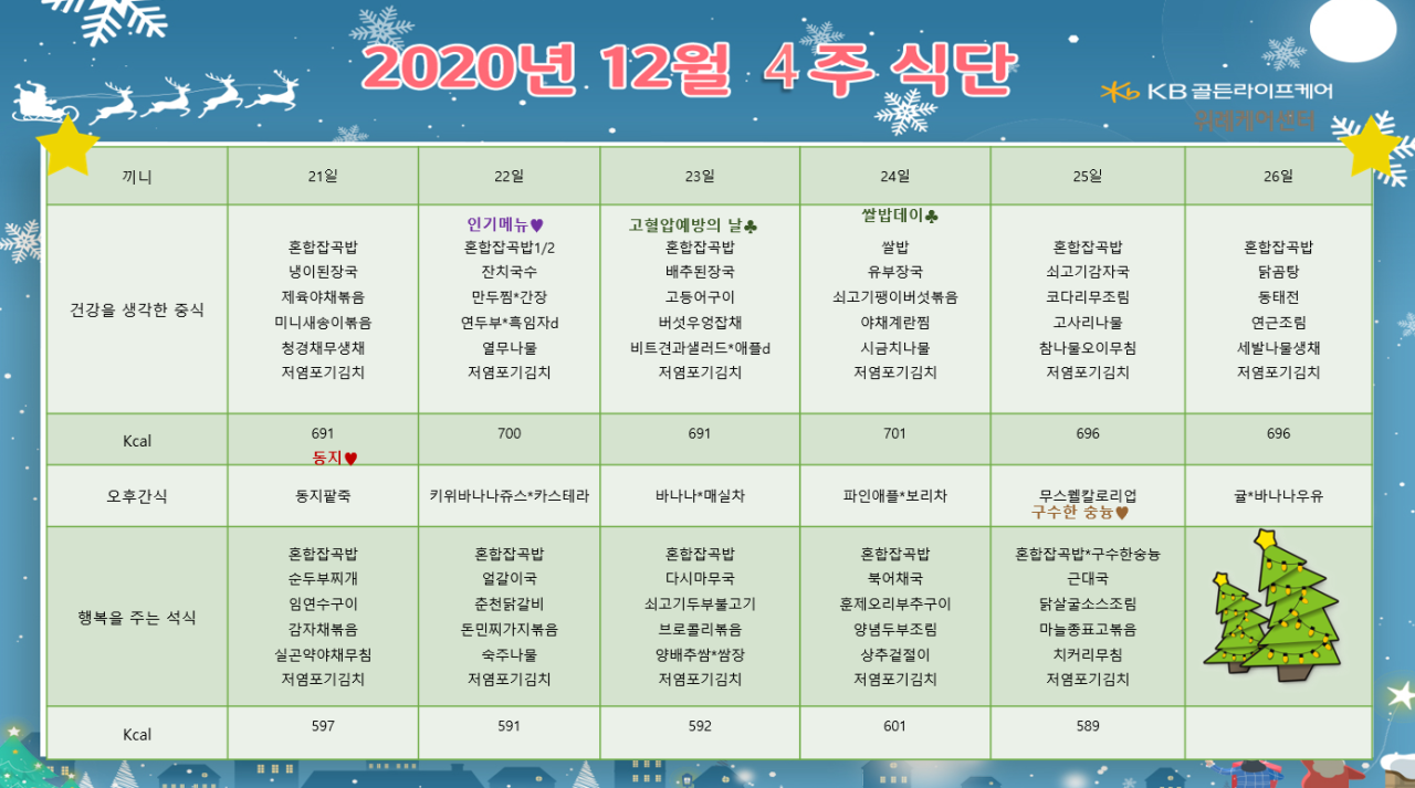 위례케어센터 [식단안내] 위례 케어센터 12월 4주차 식단표 페이지 정보 작성자 KB 골든라이프케어 댓글 0건 조회 3,861회 작성일 20-12-18 17:51 목록 본문 목록 이전글[식단안내] 위례 빌리지 12월 5주차 식단표 20.12.24 다음글[식단안내] 위례 빌리지 12월 4주차 식단표 20.12.18