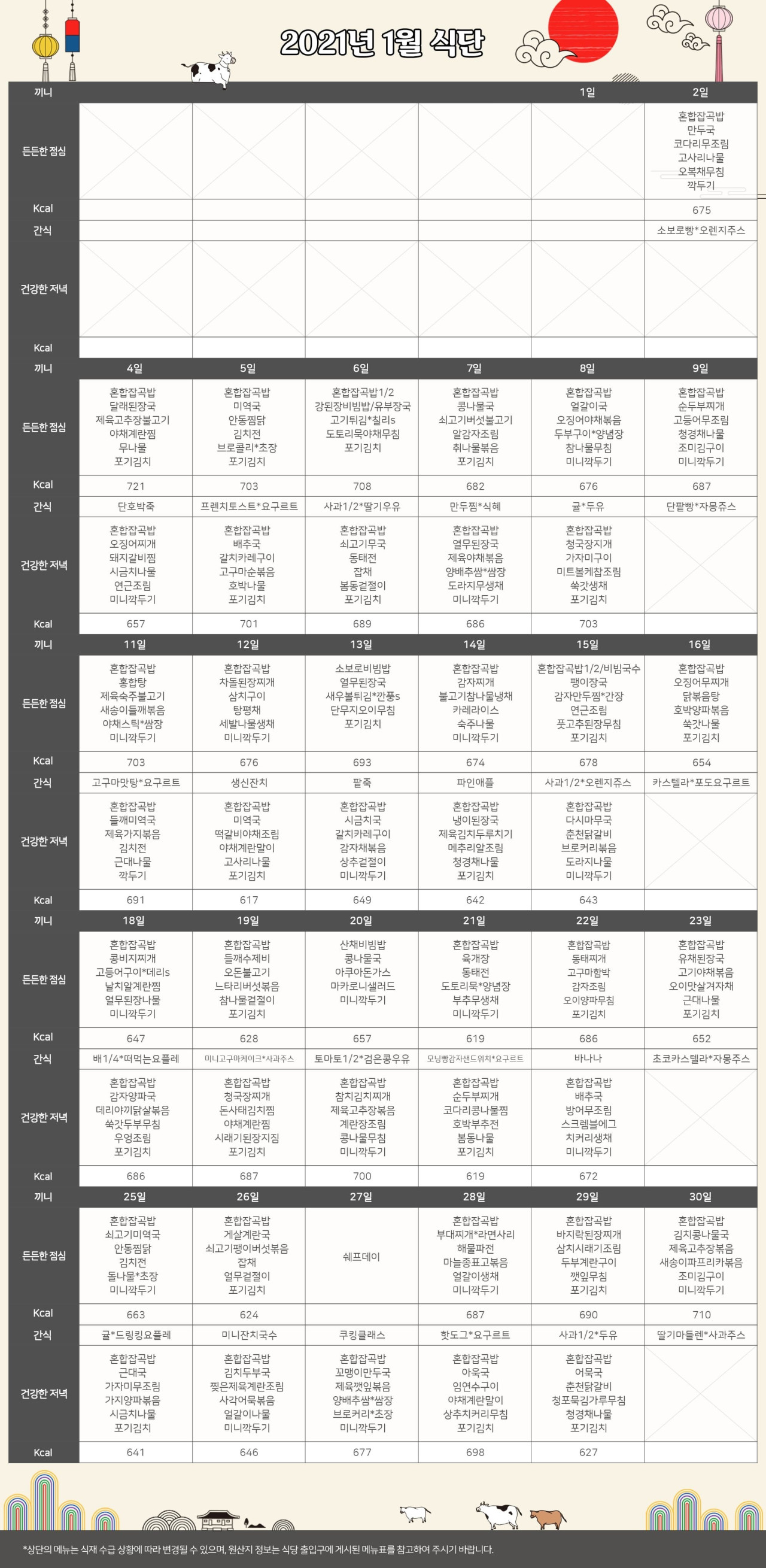 강동케어센터 [식단 안내] 2021년 강동케어센터 1월 식단표 페이지 정보 작성자 KB 골든라이프케어 댓글 0건 조회 3,535회 작성일 20-12-30 09:23 목록 본문 목록 이전글[프로그램 안내] 2021년 강동케어센터 1월 프로그램 20.12.30 다음글[식단안내] 위례 케어센터 12월 5주차 식단표 20.12.24