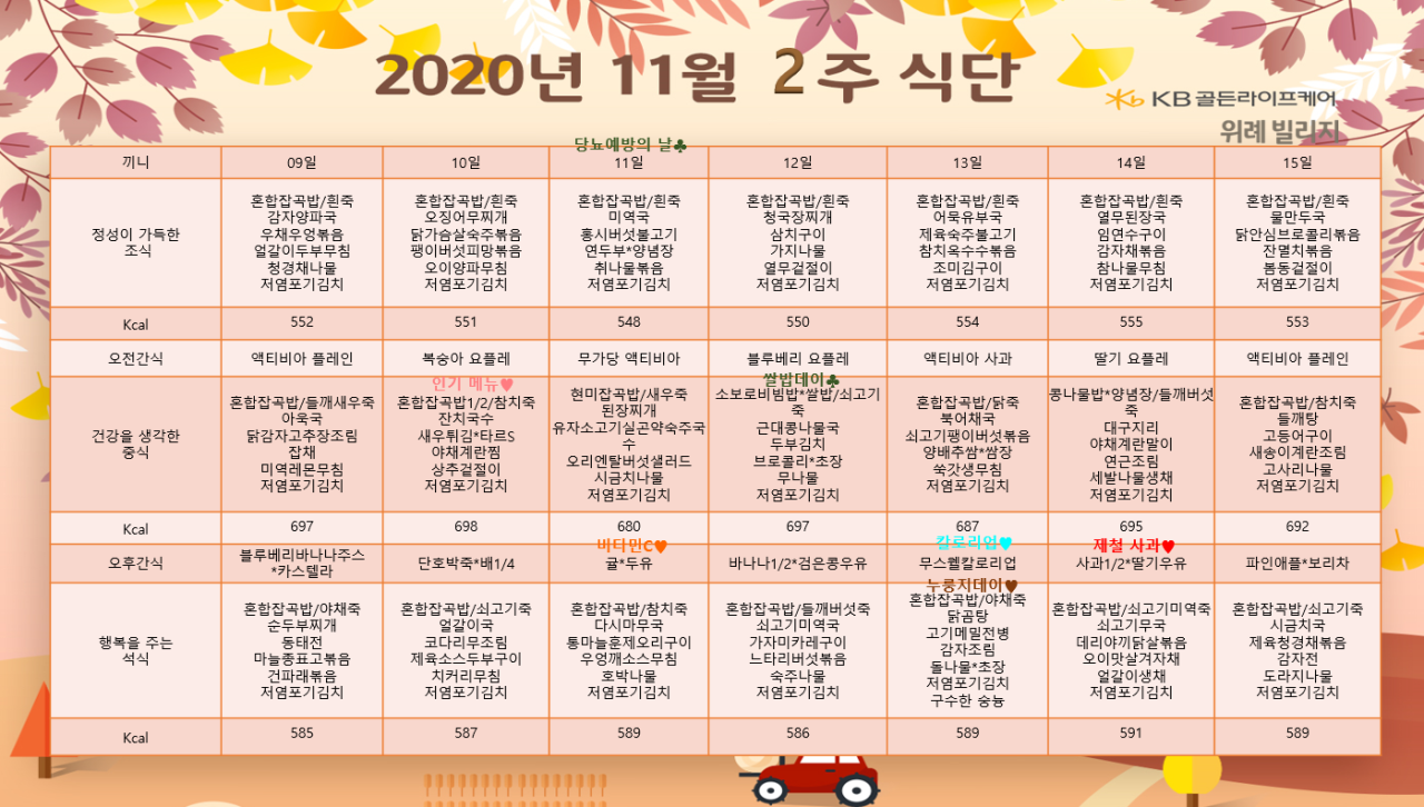 위례빌리지 [식단안내] 위례 빌리지 11월 2주차 식단표 페이지 정보 작성자 KB 골든라이프케어 댓글 0건 조회 3,617회 작성일 20-11-05 19:05 목록 본문 목록 이전글[식단안내] 위례 케어센터 11월 2주차 식단표 20.11.05 다음글[프로그램 안내] 2020년 위례 빌리지 11월 프로그램 일정표 20.11.04