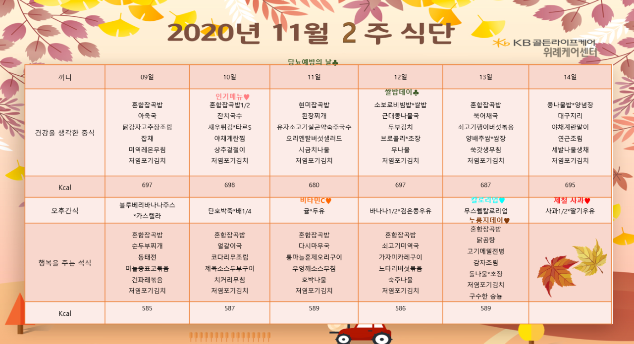 위례케어센터 [식단안내] 위례 케어센터 11월 2주차 식단표 페이지 정보 작성자 KB 골든라이프케어 댓글 0건 조회 3,814회 작성일 20-11-05 19:05 목록 본문 목록 이전글[식단안내] 위례 빌리지 11월 2주차 식단표 20.11.11 다음글[식단안내] 위례 빌리지 11월 2주차 식단표 20.11.05