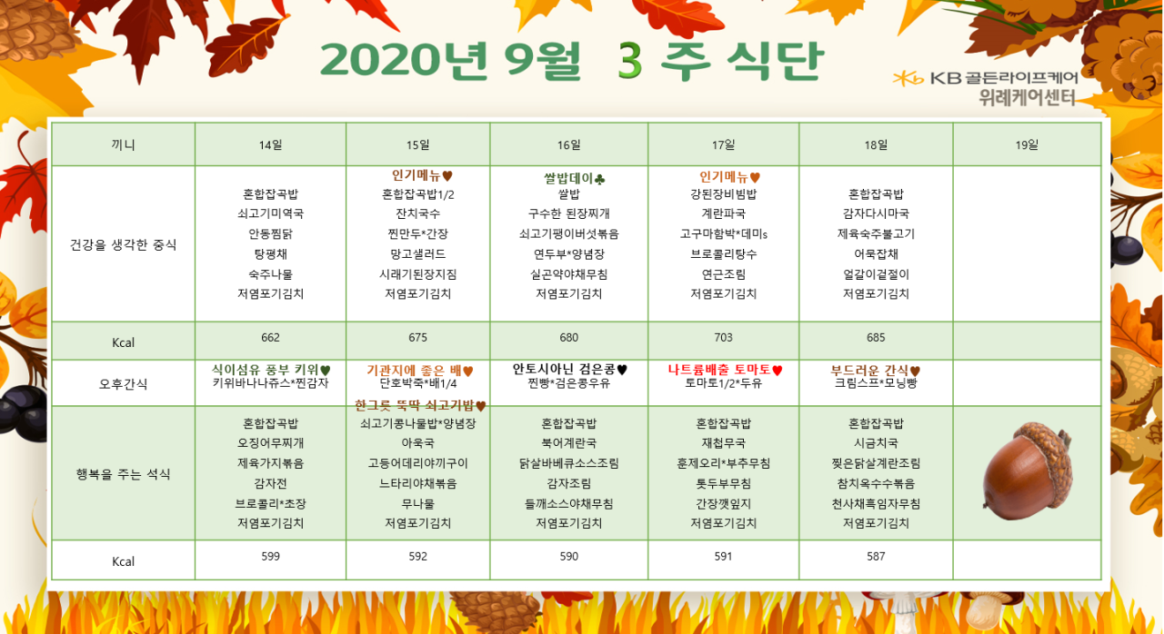 위례케어센터 [식단안내] 위례 케어센터 9월 3주차 식단표 페이지 정보 작성자 KB 골든라이프 댓글 0건 조회 3,910회 작성일 20-09-11 17:48 목록 본문 목록 이전글[식단안내] 위례 빌리지 9월 4주차 식단표 20.09.21 다음글[식단안내] 위례 빌리지 9월 3주차 식단표 20.09.11