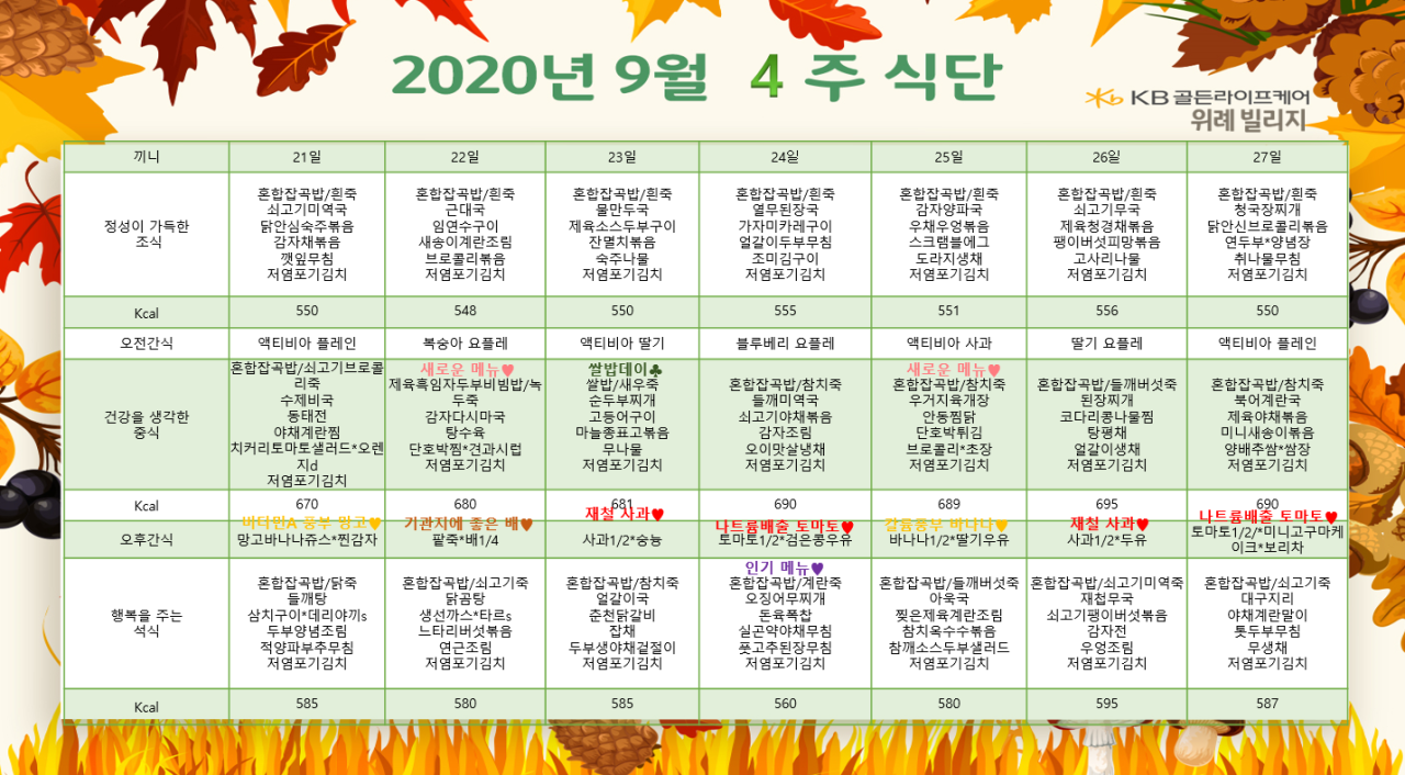 위례빌리지 [식단안내] 위례 빌리지 9월 4주차 식단표 페이지 정보 작성자 KB 골든라이프 댓글 0건 조회 3,588회 작성일 20-09-21 09:32 목록 본문 목록 이전글[식단안내] 위례 케어센터 9월 4주차 식단표 20.09.21 다음글[식단안내] 위례 케어센터 9월 3주차 식단표 20.09.11