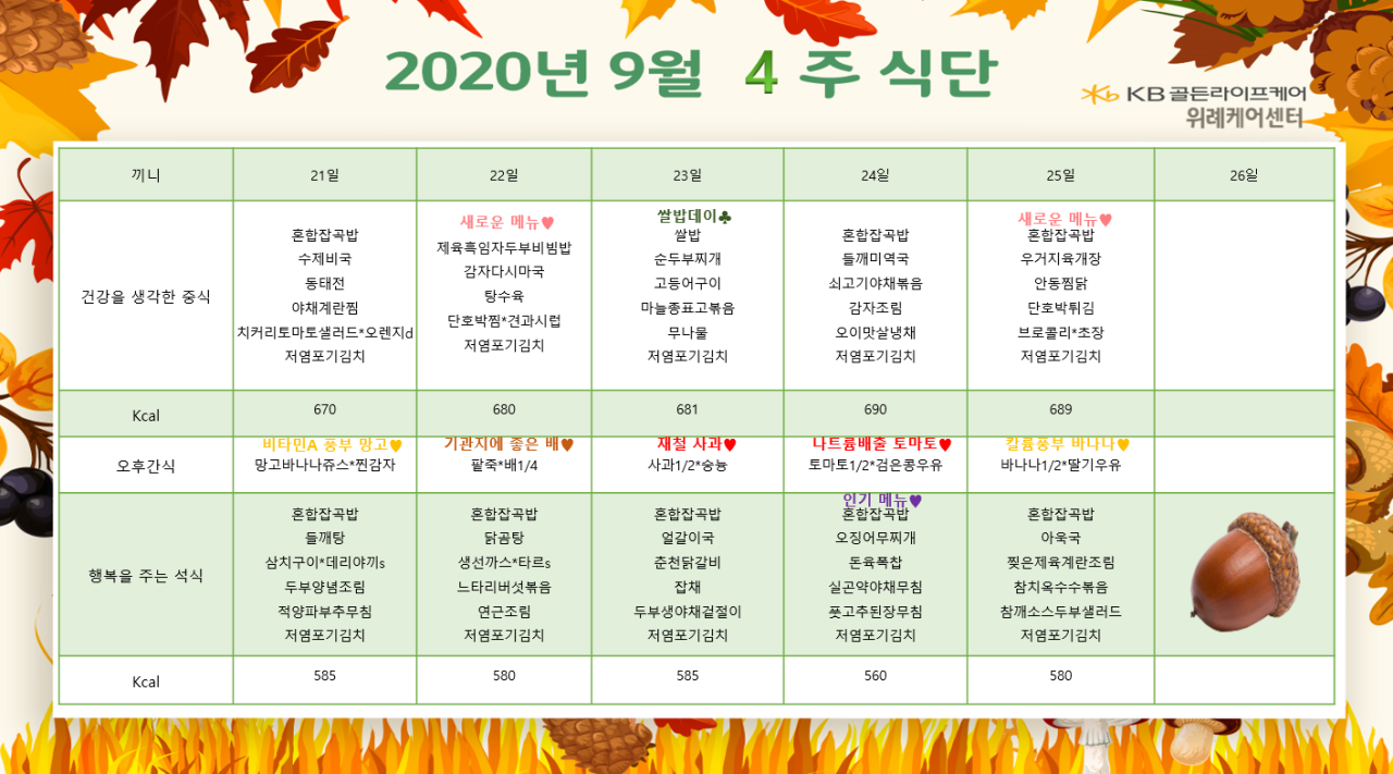 위례케어센터 [식단안내] 위례 케어센터 9월 4주차 식단표 페이지 정보 작성자 KB 골든라이프 댓글 0건 조회 3,845회 작성일 20-09-21 09:33 목록 본문 목록 이전글[식단안내] 위례 빌리지 9월 5주차 식단표 20.09.25 다음글[식단안내] 위례 빌리지 9월 4주차 식단표 20.09.21